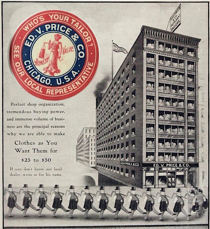 Businesses that didn’t go under completely in the 1930s often worked out buyouts and mergers instead, hoping to pool remaining resources. Leopold Kling rented out large portions of the Wabansia plant to other businesses, and acquired the cheaper manufacturing services of Davenport, Iowa’s William Bradford Company as his new primary producer of men’s clothes. Kling Bros. also took a controlling interest in the Louis A. Walton Company and former rivals Lamm & Co., Leeds Tailors Inc., and Ed V. Price & Co. In 1937, the Kling corporate offices moved from Wabansia to the Price Building [pictured] at 319 West Van Buren Street.