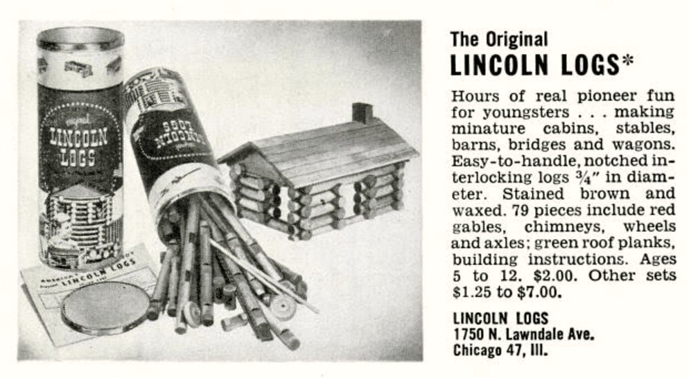 Besides the appreciated Fort Dearborn shoutout, the key takeaway from the copy above is the phrase “boys and girls.” Gender based toy segregation usually dictated the selling of dollhouses to girls and train sets to boys, but Lincoln Logs were for everybody. There is even a sly reference to building “little houses” at a time when Laura Ingalls Wilder’s “Little House” book series was all the rage among the gentler set.