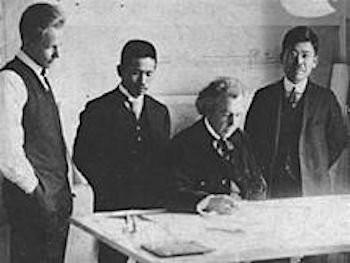 [John Lloyd Wright (left) looking over blueprints with his father in Tokyo, 1916]