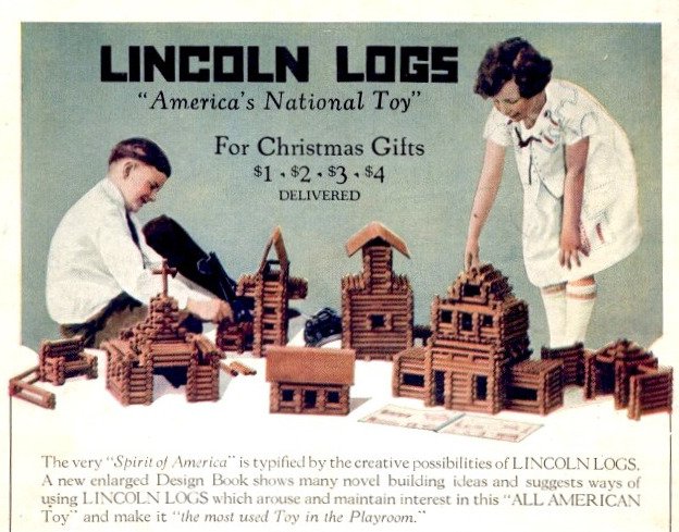 “The very ‘Spirit of America’ is typified by the creative possibilities of LINCOLN LOGS,” a 1926 magazine ad proclaimed, further describing the builder kits as “the most used Toy in the Playroom.”