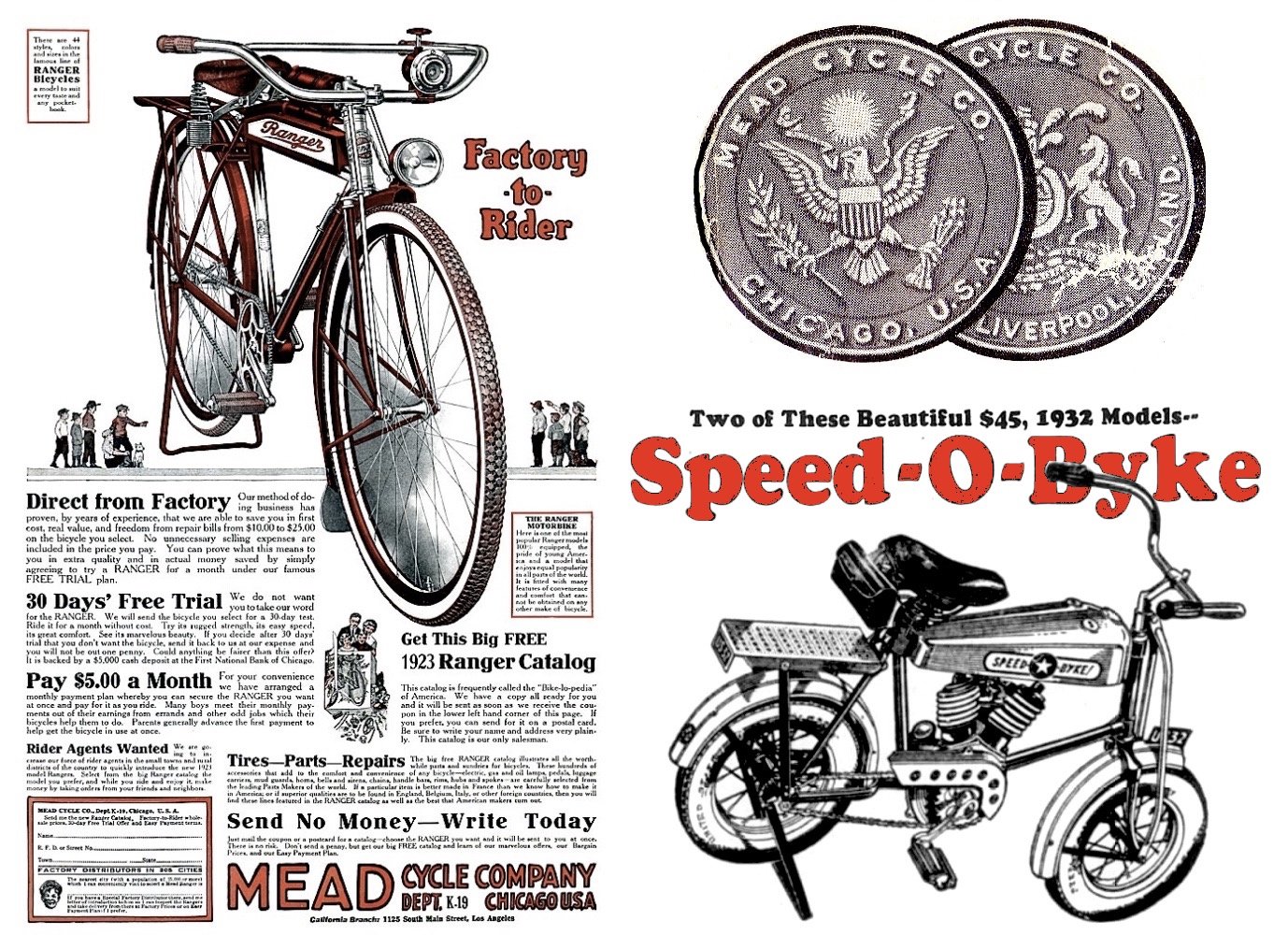[Left: 1923 ad for the popular Mead “Ranger” series. Top Right: Seals of the Mead Cycle Co. in Chicago and Liverpool. Bottom Right: The 1932 Speed-O-Byke, a George Lewis design that brought a motorcycle frame style to a bicycle]