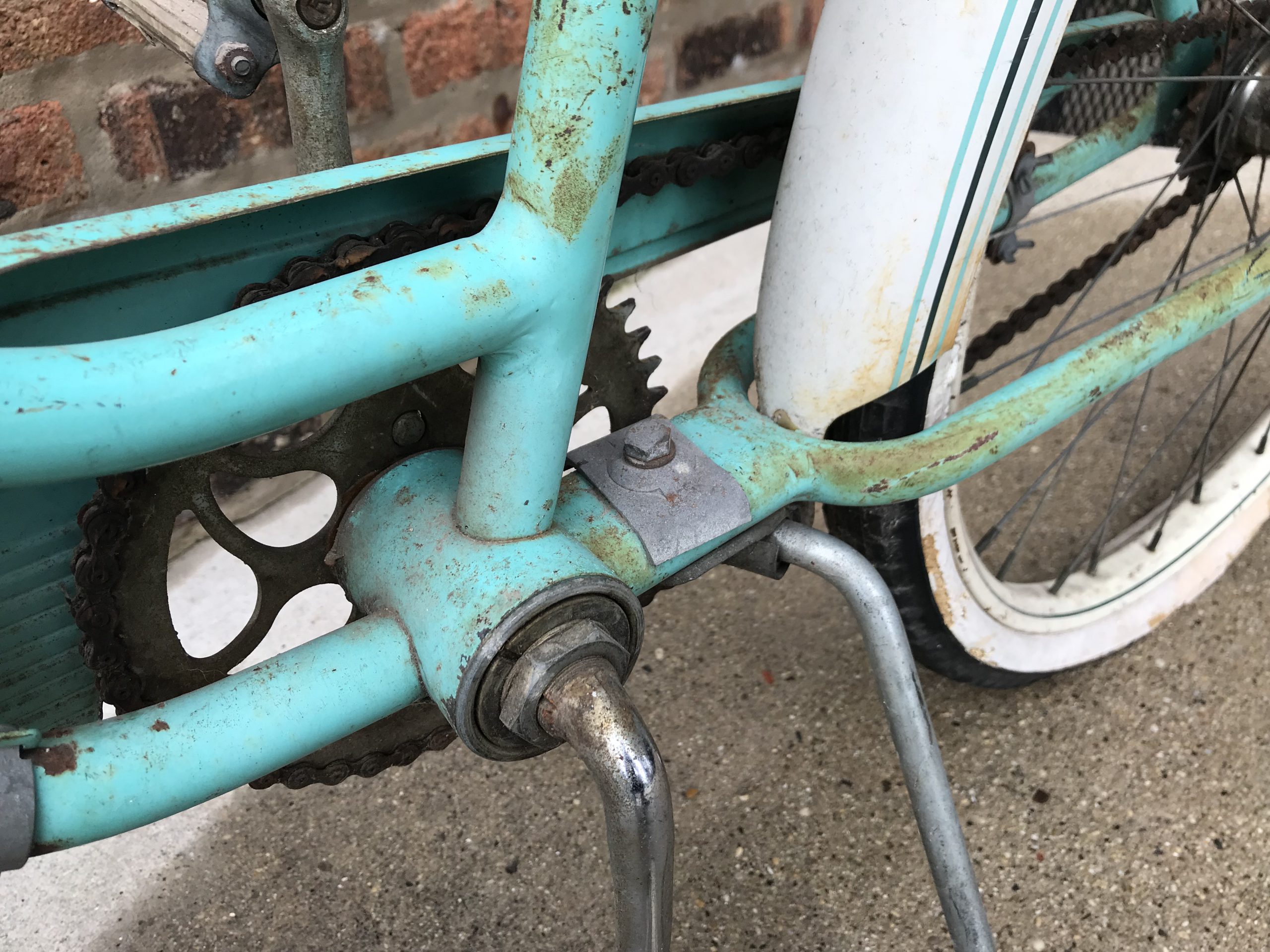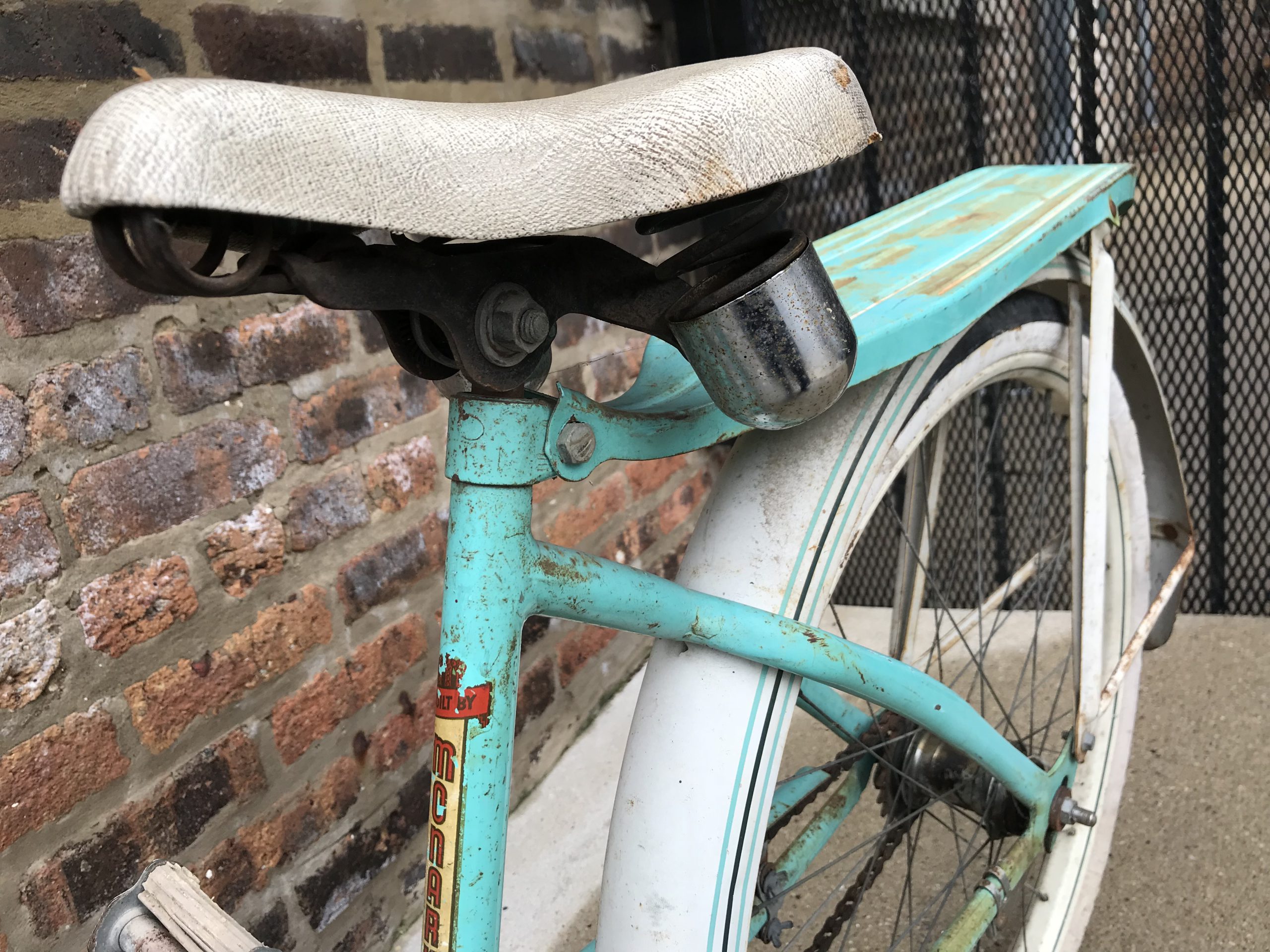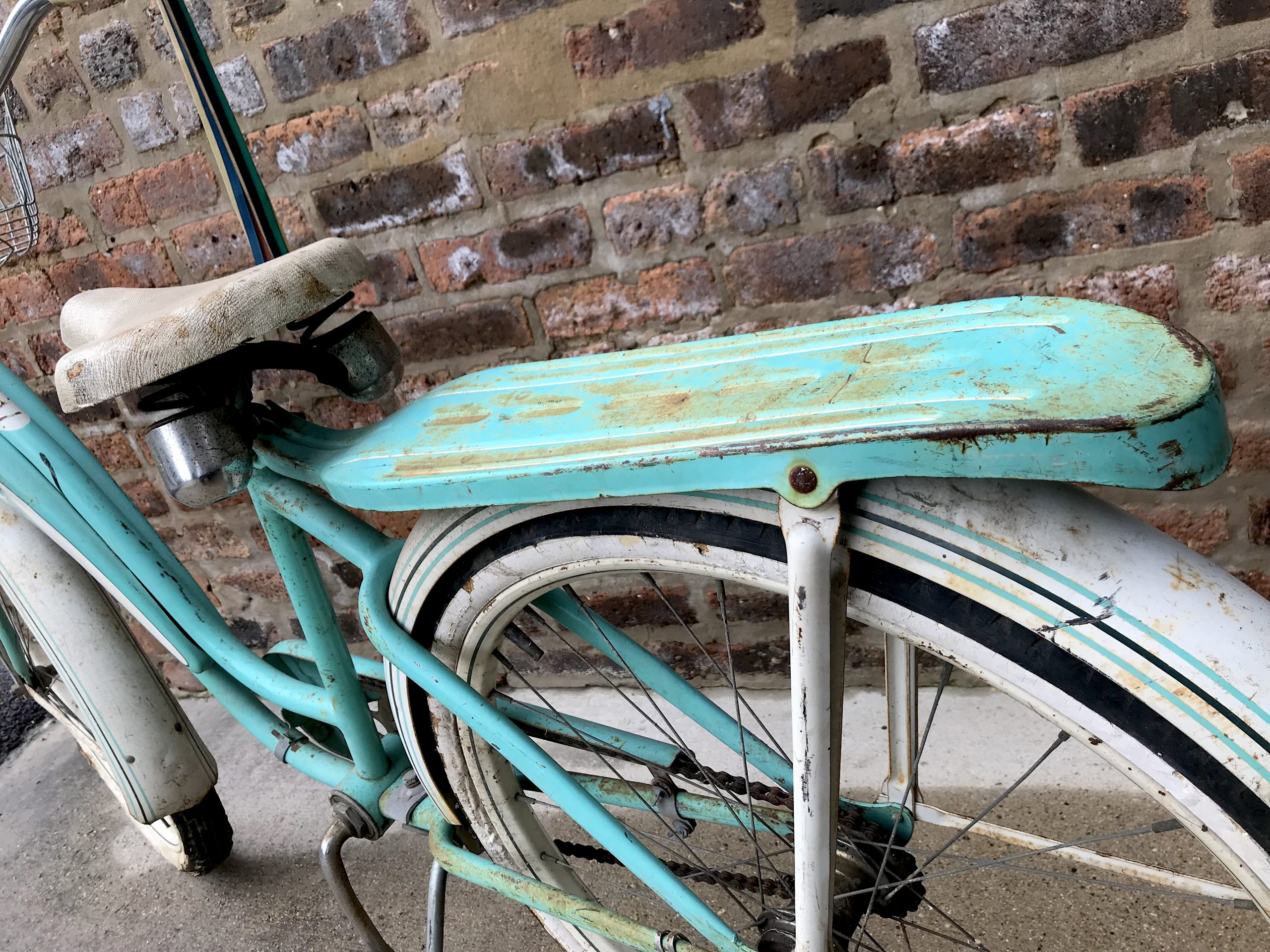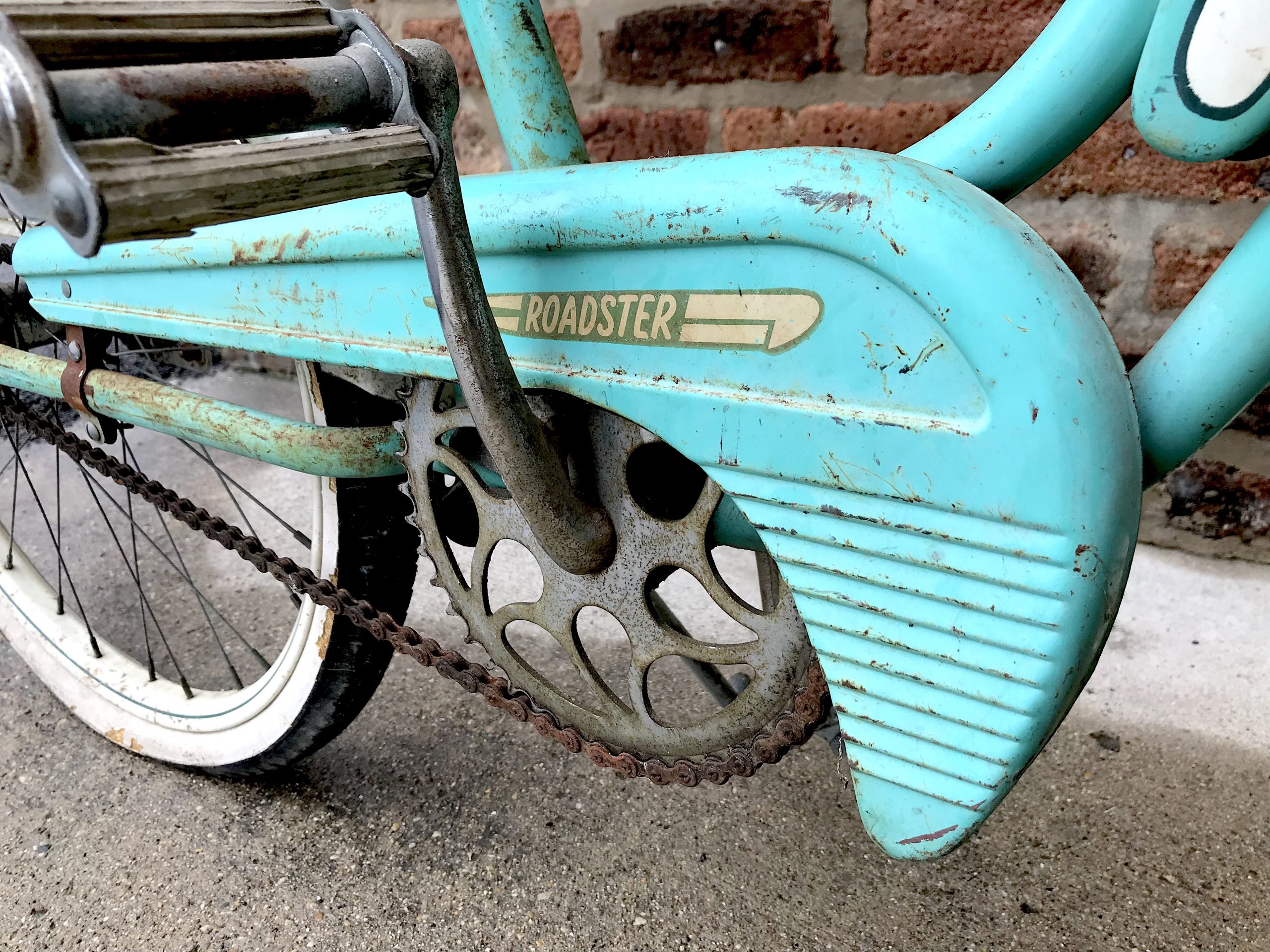 MSK’s early streamlined designs are scarcely seen out in the wild these days—many of them were broken down for scrap metal during World War II. But post-war, space-rocket tank models like the girls’ “Roadster” in our museum collection will occasionally turn up, usually cobweb-covered in someone’s shed. The glory of our particular artifact may be faded, but the rust-speckled mint paint job, crusty handlebar tassels, blown-out balloon tires, busted headlight, and bent basket wires still have a beauty to them—carrying the ghosts of marvelous sock hops and soda fountains long since past.