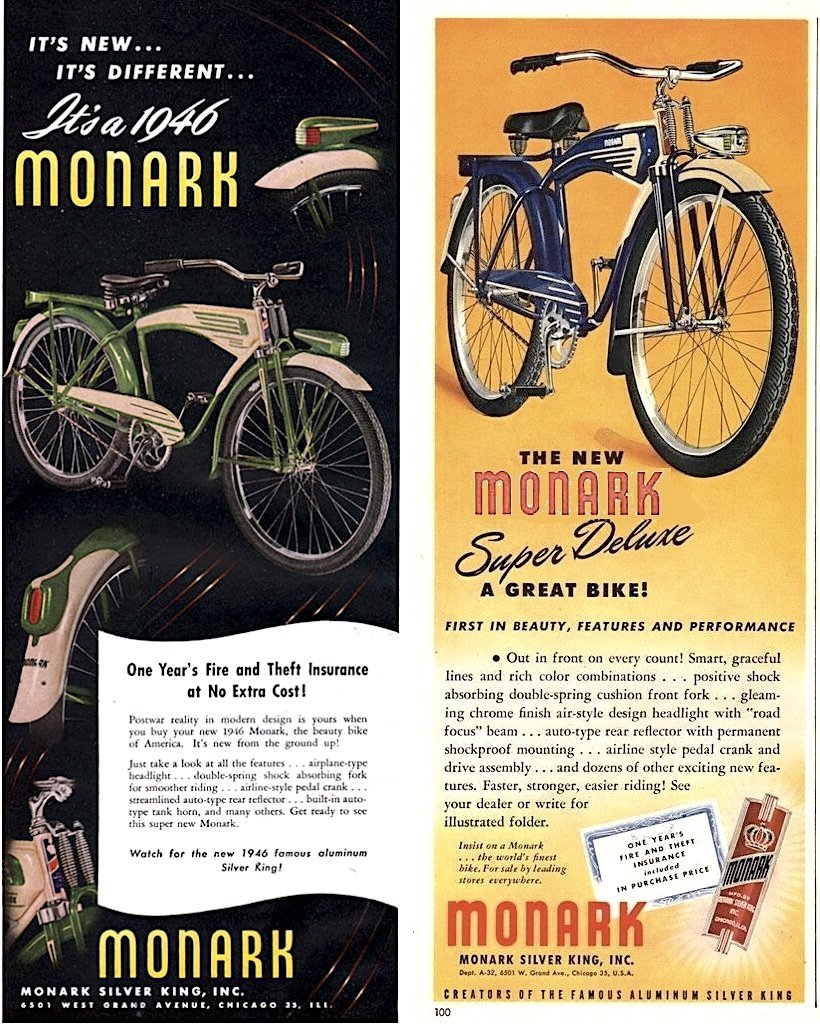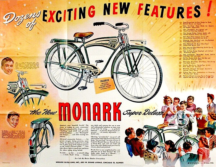 Not to be confused with the far more prominent Swedish bike maker of the same-ish name (Monark AB), nor Chicago’s earlier Monarch Cycle MFG Co. of the 1890s, the Monark Silver King Company was a short-lived but innovative Chicago bicycle manufacturer that operated from the early 1930s through the 1950s.