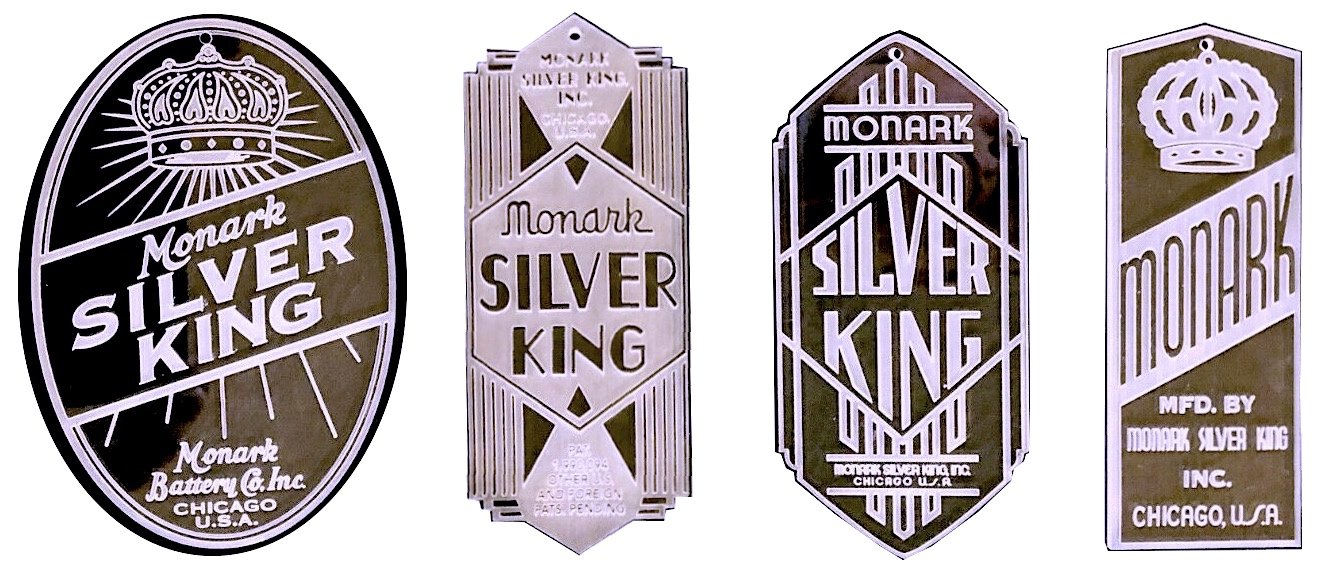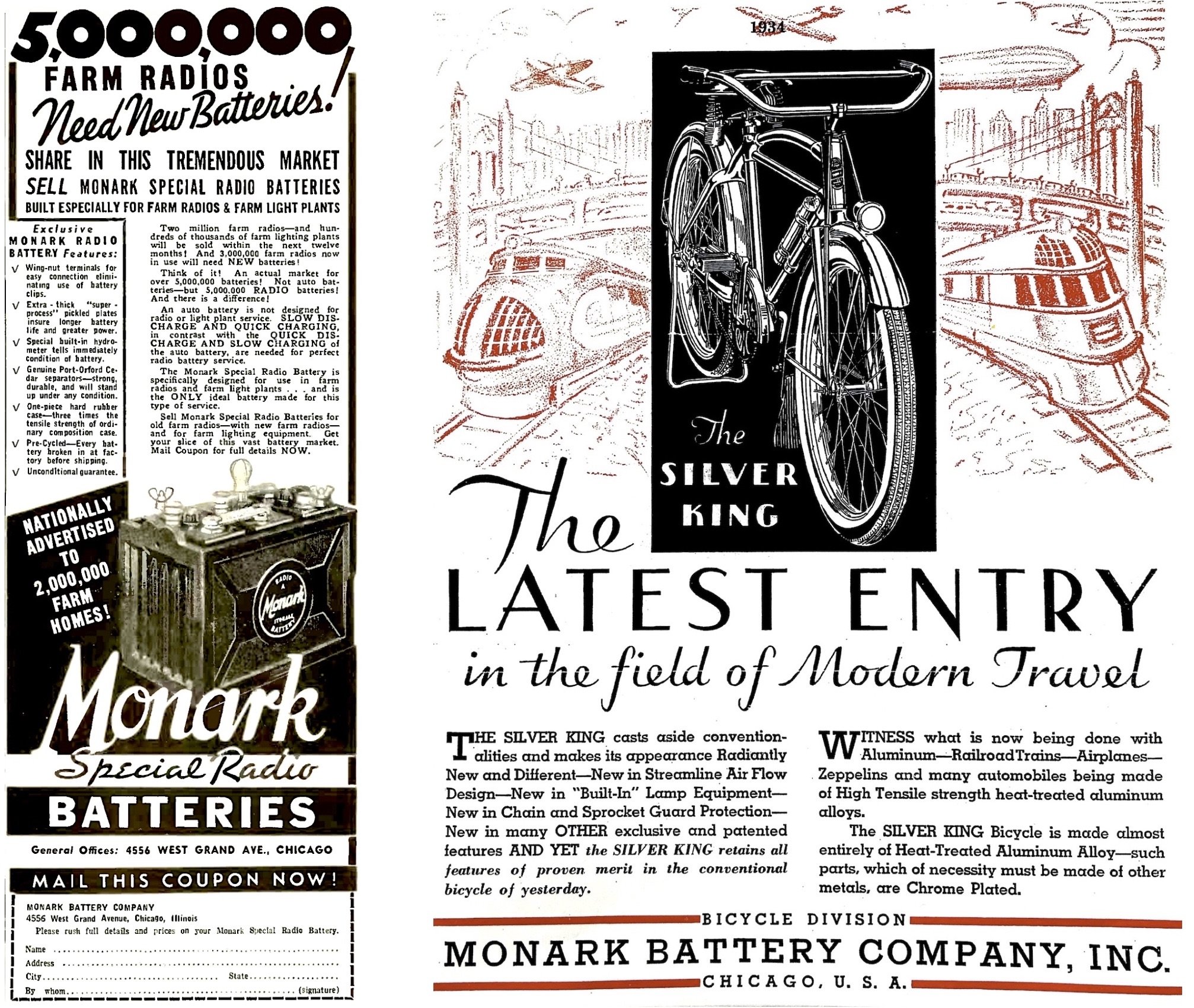 [Left: 1936 for the Monarch Battery Company’s “Special Radio Batteries.” Right: 1934 ad for the first Silver King, produced by the “Bicycle Division” of the Monark Battery Company, Inc.]