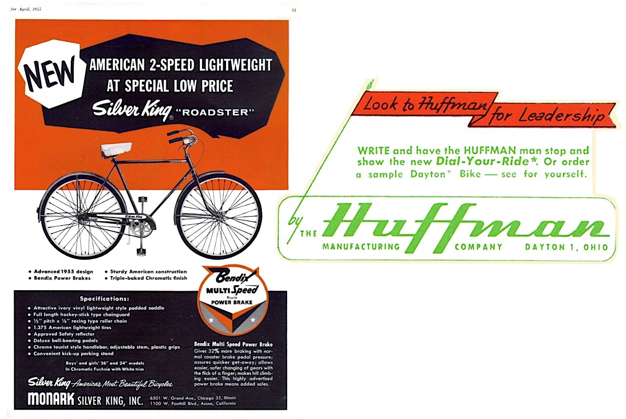 [Left: 1955 magazine ad for the Monark Silver King Roadster. Right: The Huffman MFG Co. logo; the Ohio company better known for the Huffy brand]