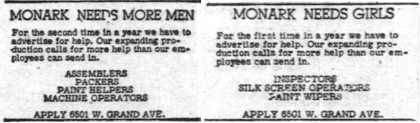 [Top: Sketch of the expanded Monark Silver King plant at 6501 W. Grand Ave, its home from 1945 to 1957. The building was taken over by Zenith as its Plant #5 in 1958, and was later torn down when neighboring Radio Flyer bought the land. Middle: 1948 newspaper seeking workers for the Grand Avenue plant. Below: Promo poster for the Monark Super Deluxe, 1947]