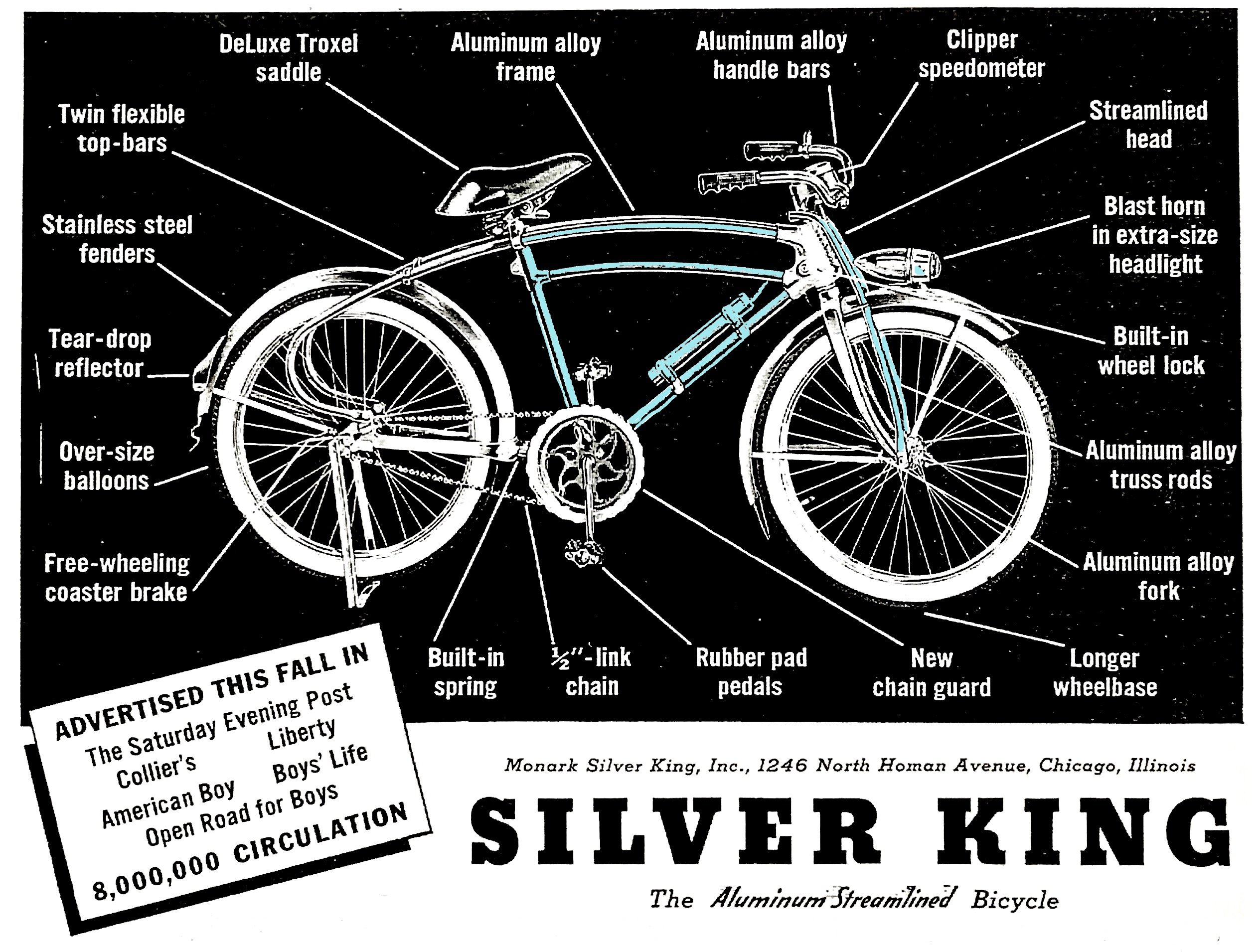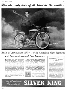 “Now—An Aluminum Bicycle! The same metal which made possible present-day high-speed trains and airplanes, makes the frame of the new-type SILVER KING bicycle. Aluminum alloy—much lighter than steel, but with 3 times the tensile strength, weight for weight. Gives faster speed, greater strength, and snappier appearance.” —advertisement for the first Monark Silver King bicycle, 1934