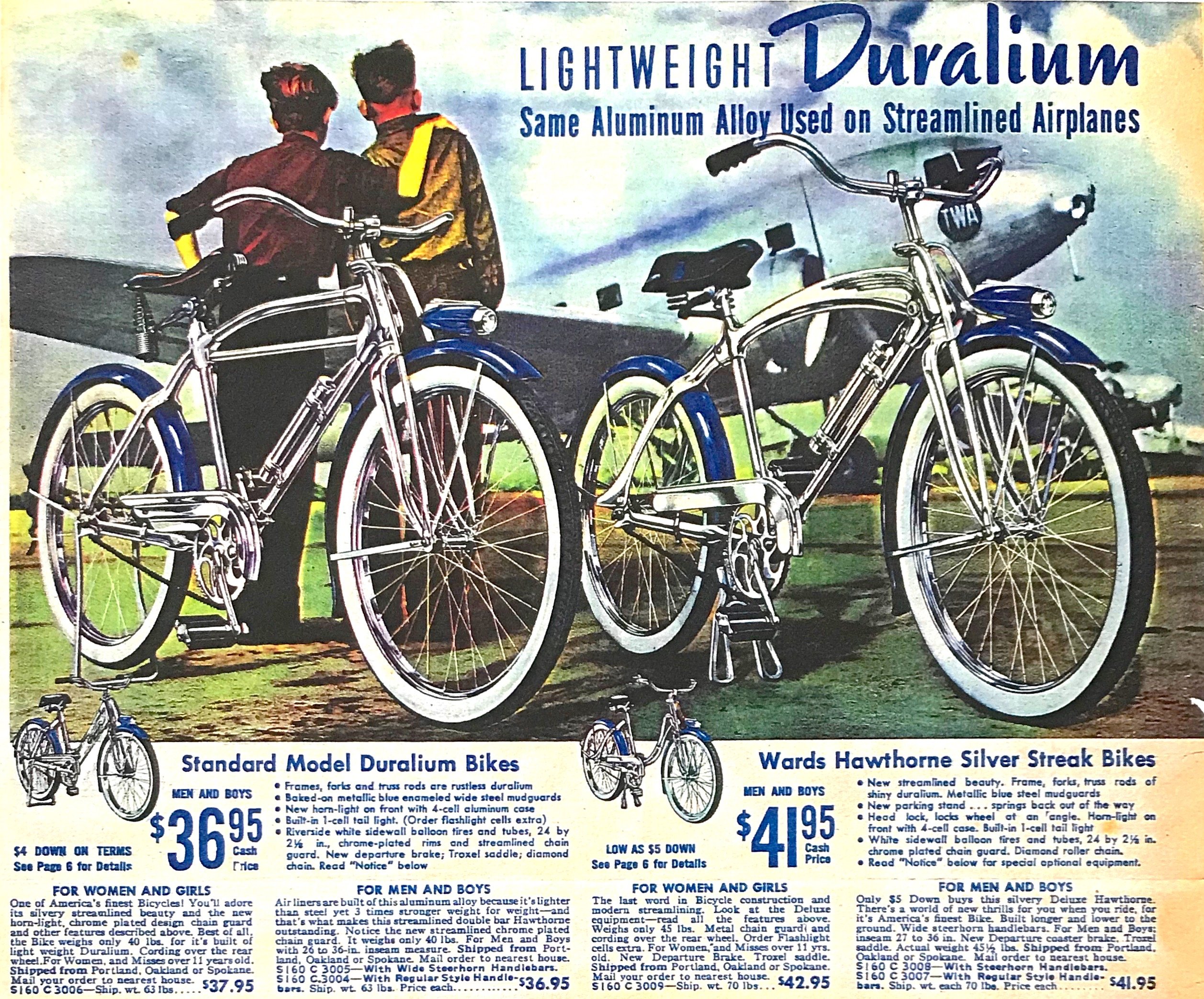 [Montgomery Ward’s early Hawthorne and Duralium bikes in the ’30s were made by Monark Silver King using the same essential designs as their own]