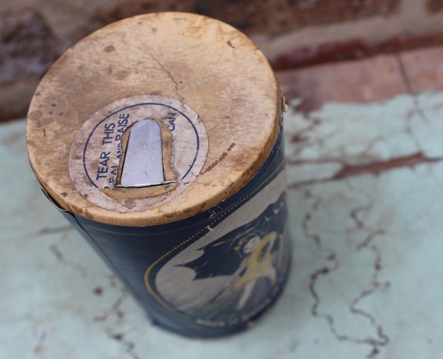 [The full-scale Morton Girl logo on the back of our 1930s container includes far more intricate Shirley Temple-esque detailing than the simplified miniature logo on the front side]
