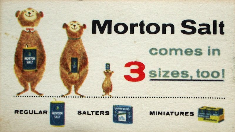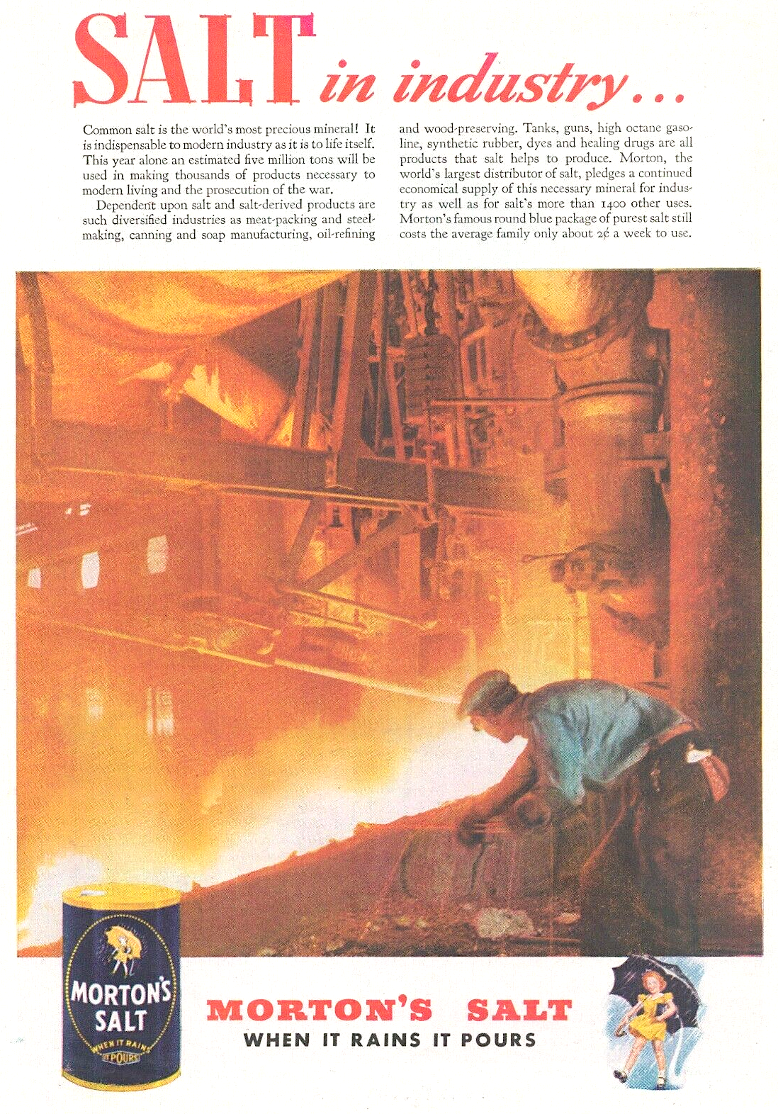 “Tanks, guns, high octane gasoline, synthetic rubber, dyes and healing drugs are all products that salt helps to produce,” read a 1943 ad. “Morton, the world’s largest distributor of salt, pledges a continued economical supply of this necessary mineral for industry as well as for salt’s more than 1400 other uses. Morton’s famous round blue package of purest salt still costs the average family only about 26 a week to use.”