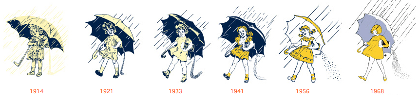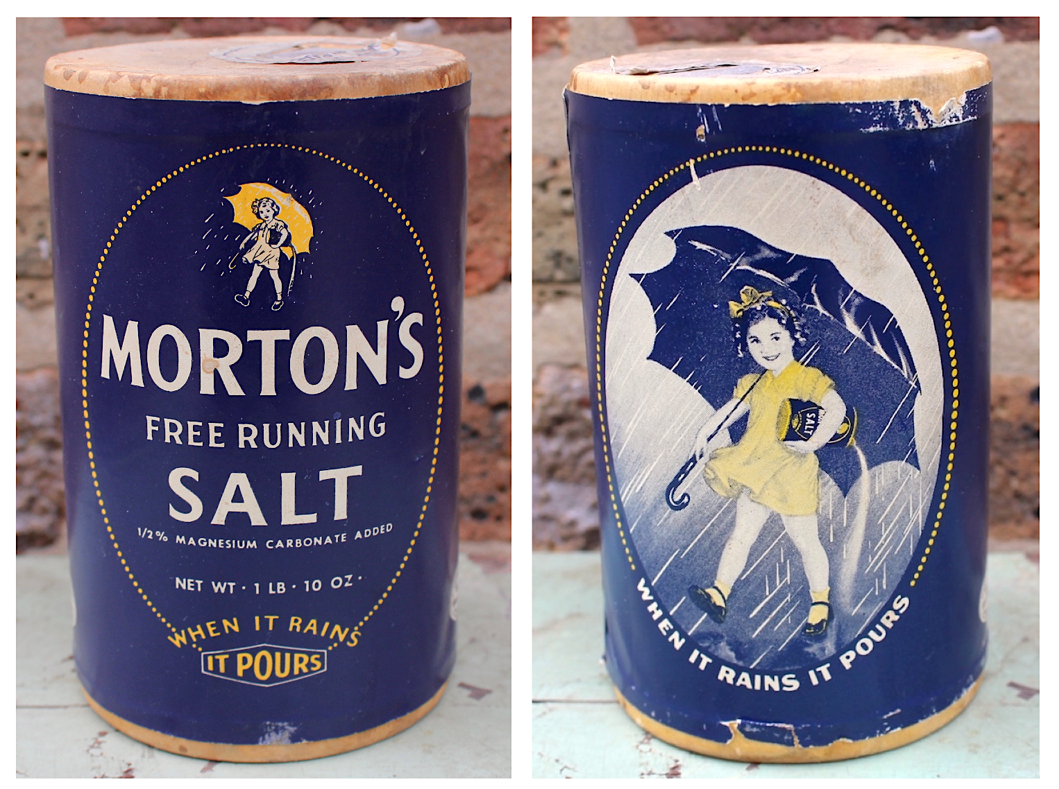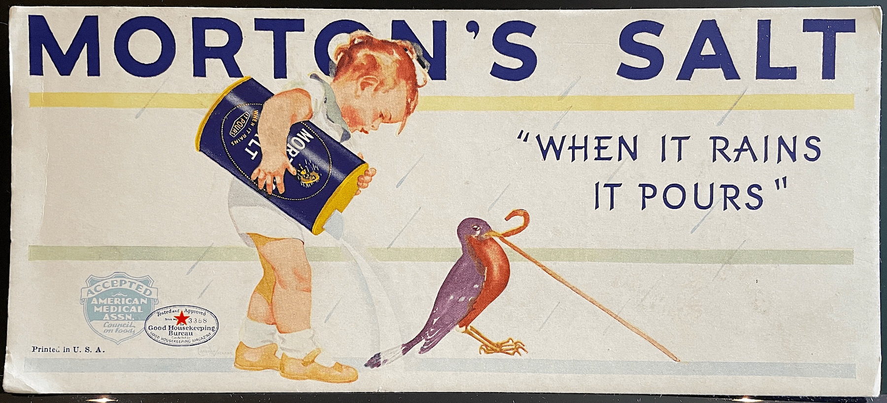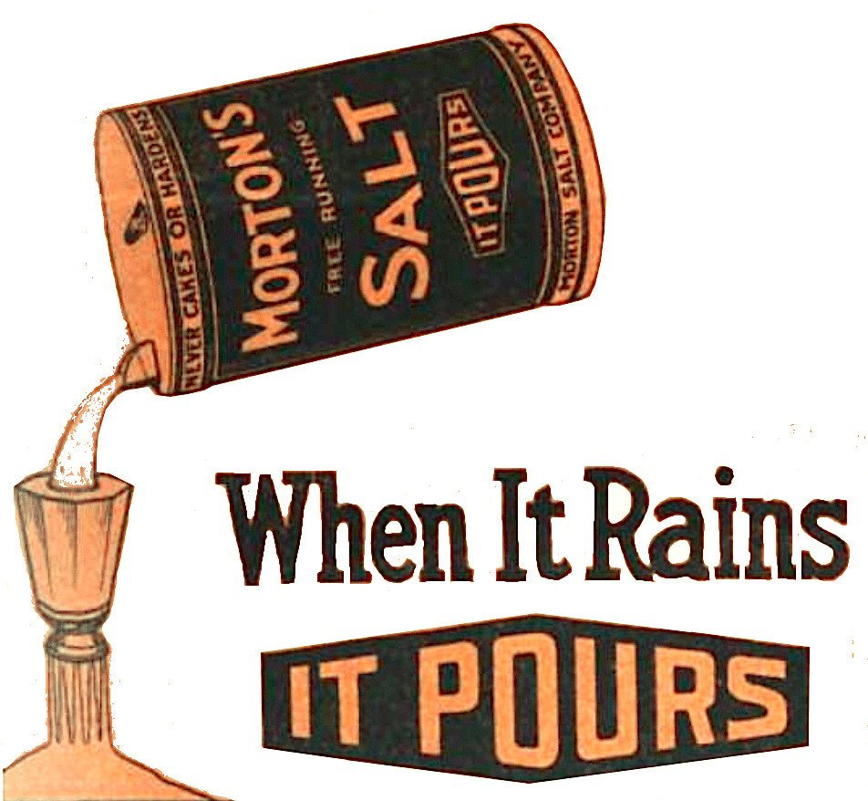 According to company lore, Morton rejected several pitches from the Philadelphia advertising agency N.W. Ayer & Son before jumping on a back-up idea that became the slogan “When It Rains, It Pours”—a clever reference to the aforementioned fact that Morton’s salt wouldn’t cake together when the humidity rose. From this concept, the first Morton Girl, with her yellow dress and umbrella, emerged.