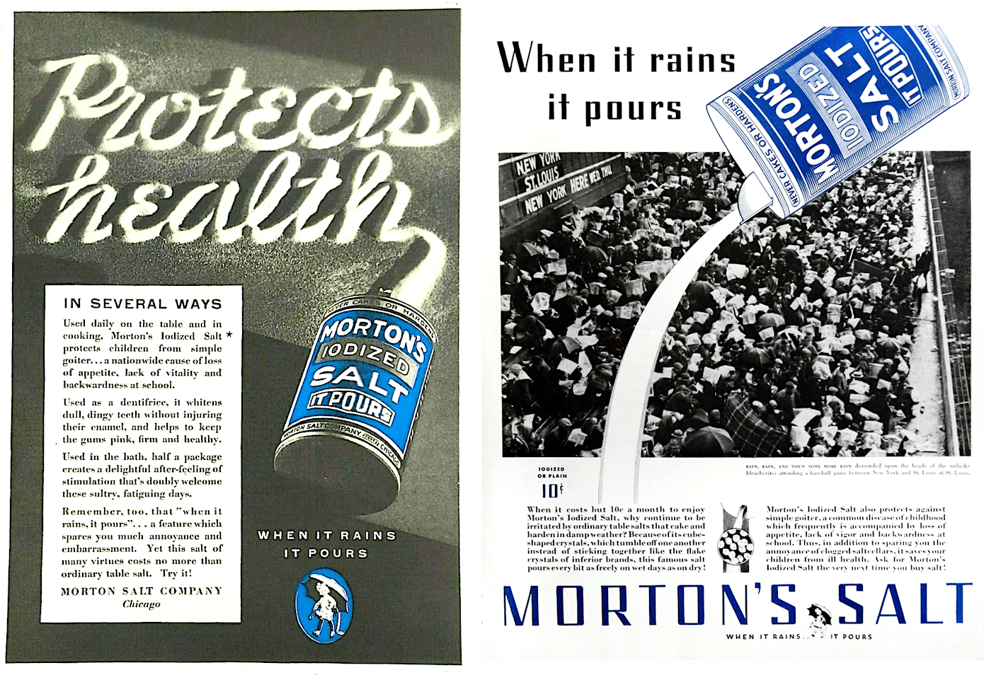 [Advertisements for Morton’s Iodized Salt, from 1929 (left) and 1932]