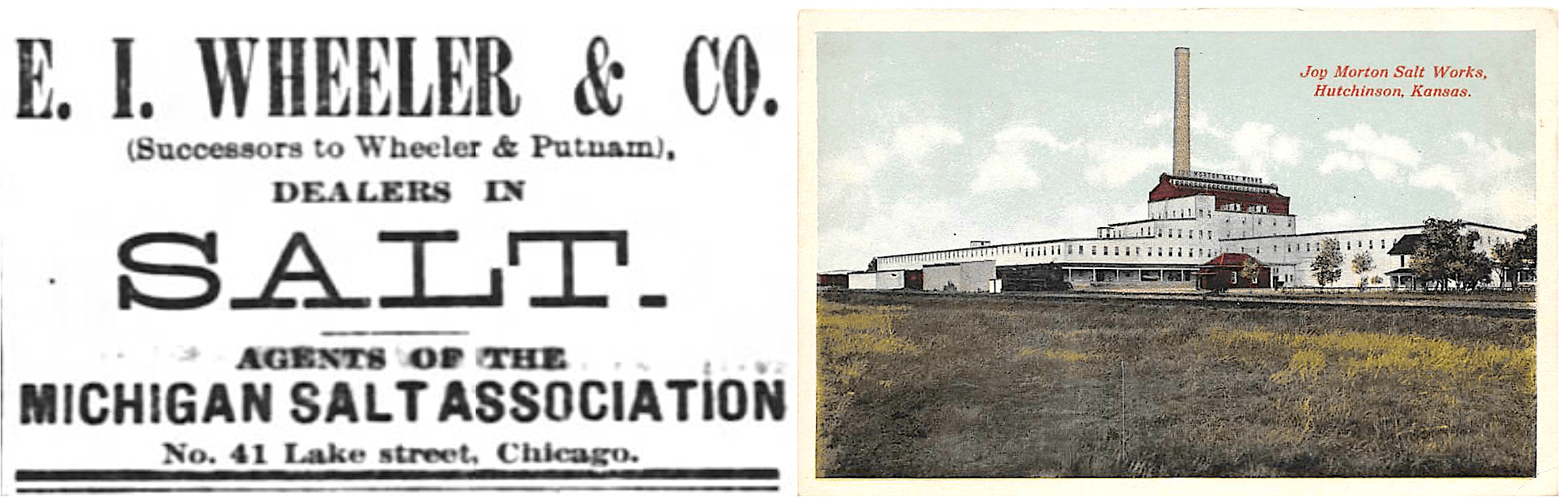 [Left: 1880 ad for E. I. Wheeler & Co., the precursor to Morton Salt. Right: The Joy Morton Salt Works in Hutchinson, Kansas, opened in 1898 and shown here, c. 1910s.]
