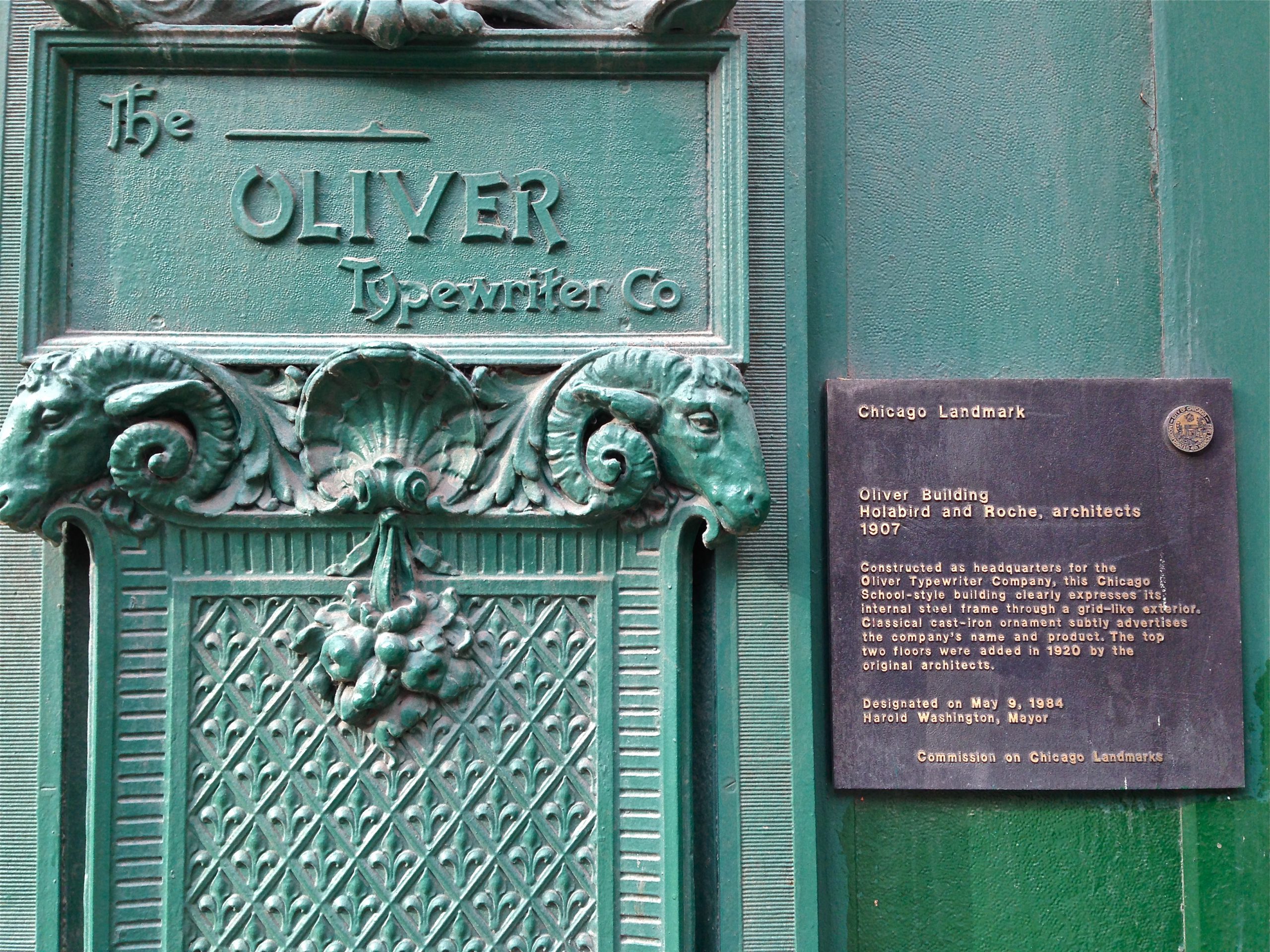 It was no humble structure, either. The red brick high-rise, designed by Holabird and Roche, is now a historic landmark, and looks every bit as impressive as it did in its own day, complete with the original cast iron, Oliver-trademarked ornamentation. It was truly a “model office building, combining with unusual architectural beauty every known facility for administering the affairs of the big corporation with ease, accuracy and dispatch.