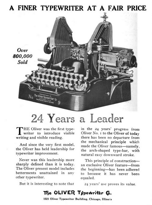 “Such revolutionary advances as visible writing, rigid typebars, writing in colors, automatic division of the keyboard, touch writing, Printype [a unique typeface design to look more like traditional book fonts], line-ruling devices, paper-holder, and many improvements of importance, owe their birth, their growth and their adoption by the public to the steadfast adherence of the Oliver Typewriter Company to proper principles of typewriter construction.”