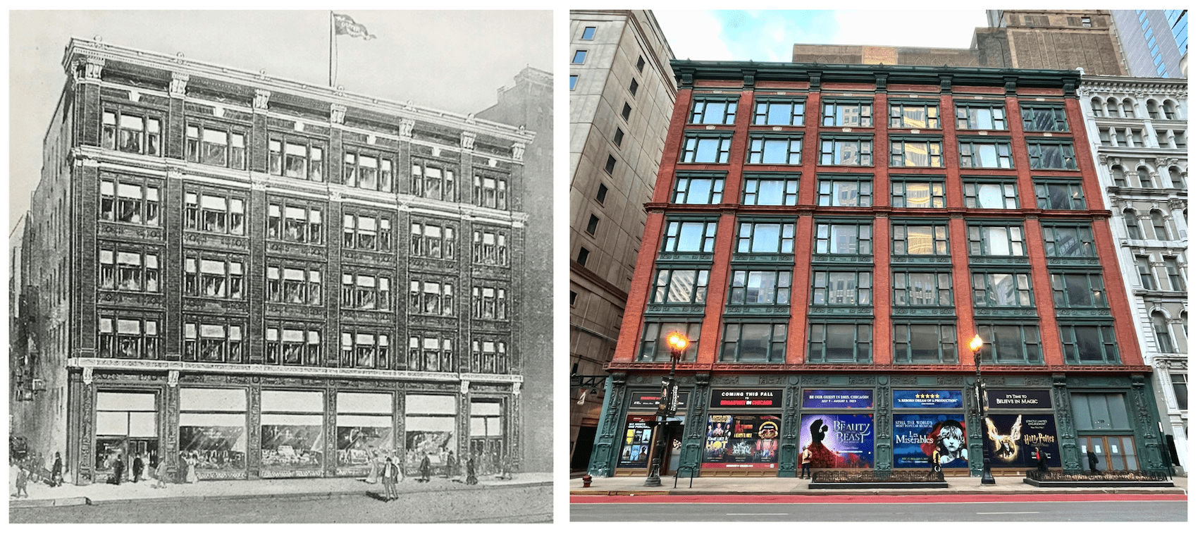 [The Oliver Building was five stories tall when it opened in 1907. It was then expanded to seven floors in 1920. It’s currently owned by the Goodman Theater. Photo on right by Andrew Clayman, 2024]