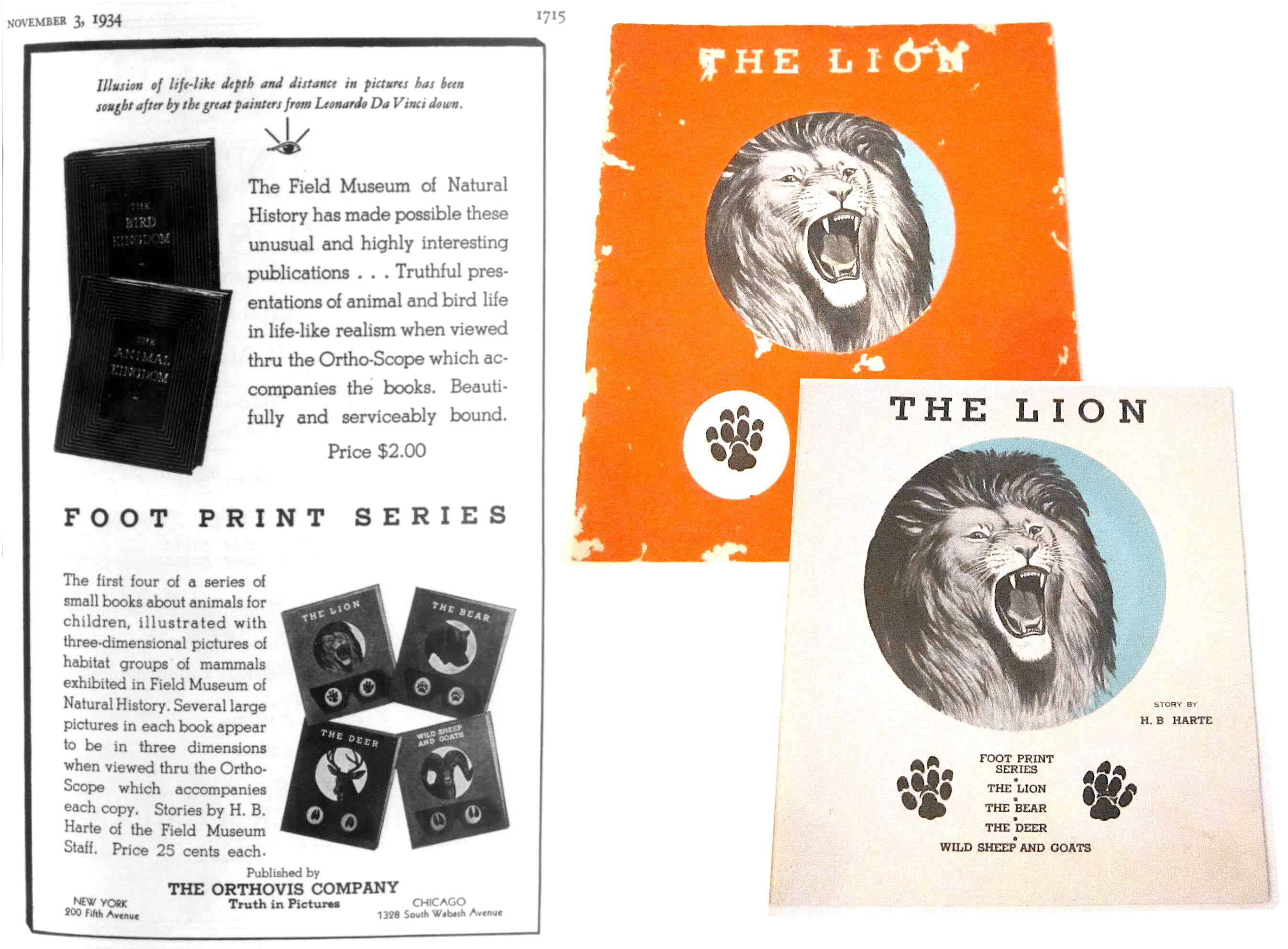 [Left: 1934 magazine ad for the “Foot Print Series” of books that Orthovis published in partnership with the Field Museum. Right: A look at the cover and title page of The Lion, another volume in the Foot Print Series of 1934 but as of yet not a prestigious Chicago-based TV show in the 21st century]