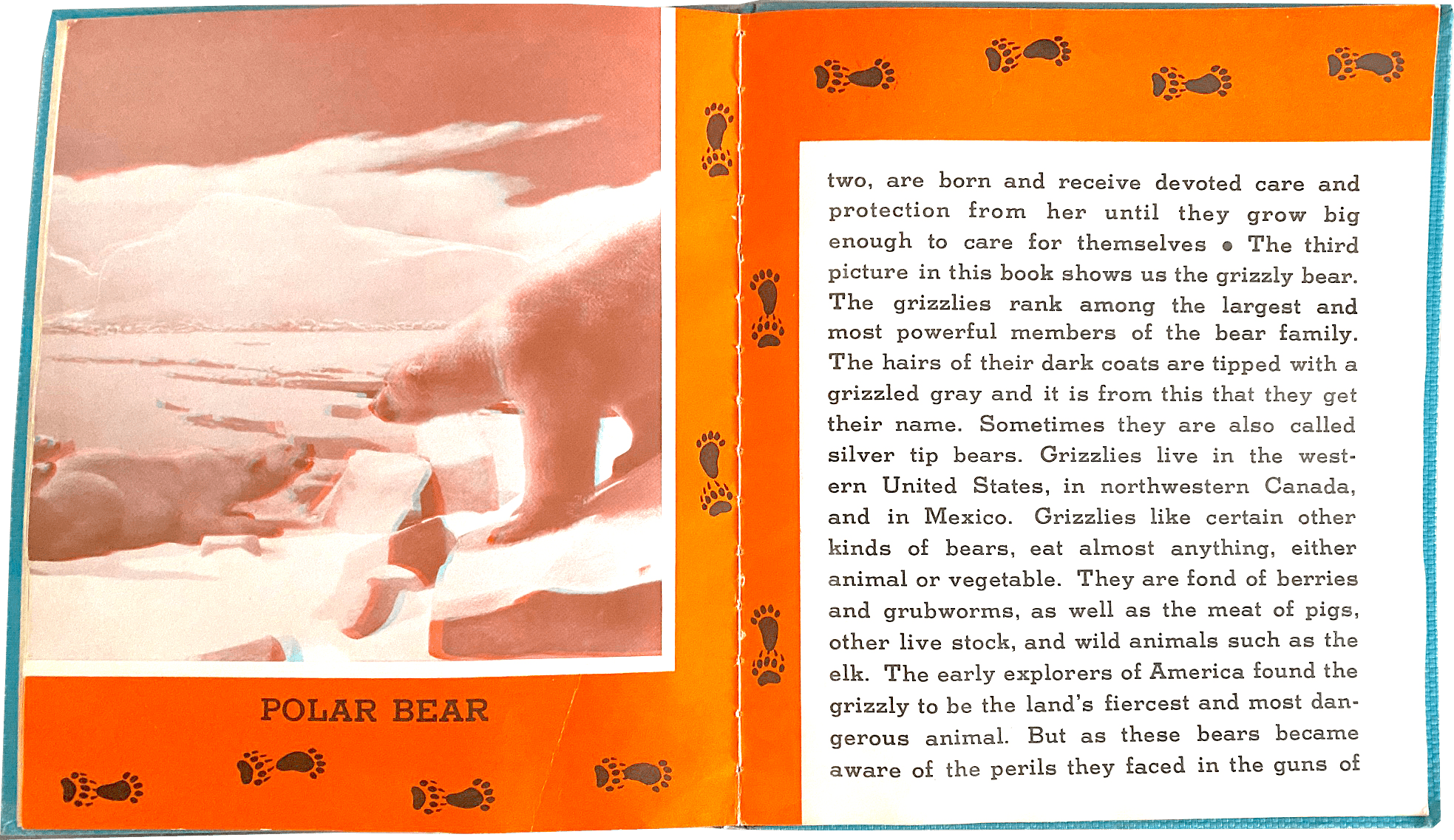 Published in 1934 by an upstart Chicago firm known as the Orthovis Company, The Bear was but one volume in “The Foot Print Series”—a collection of 3-D wildlife books developed in conjunction with the Field Museum over a 2-3 year period. Other titles included The Lion, The Deer, Wild Sheep & Goats, Giants of the Animal Kingdom, Strange Animals, Monkeys & Apes, and Wild Oxen. If you had the whole set, it goes without saying that you were the coolest kid in school . . . and maybe the only one with a stable economic home life.