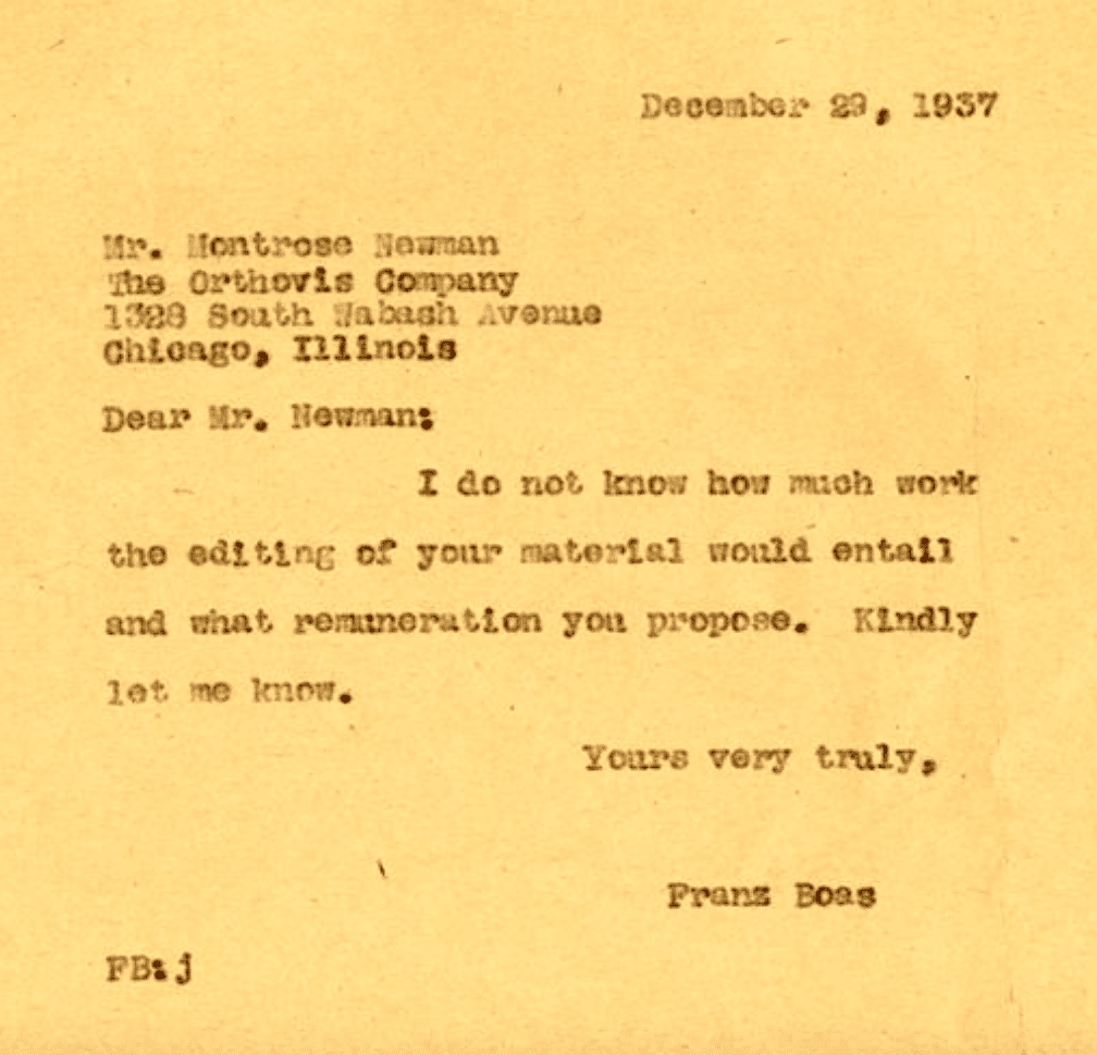 [A 1937 letter from the famed anthropologist Franz Boas to Montrose Newman, suggesting Newman had boldly recruited Boas to work on editing materials for the Orthovis Company. It doesn’t this seem arrangement was ever worked out.]