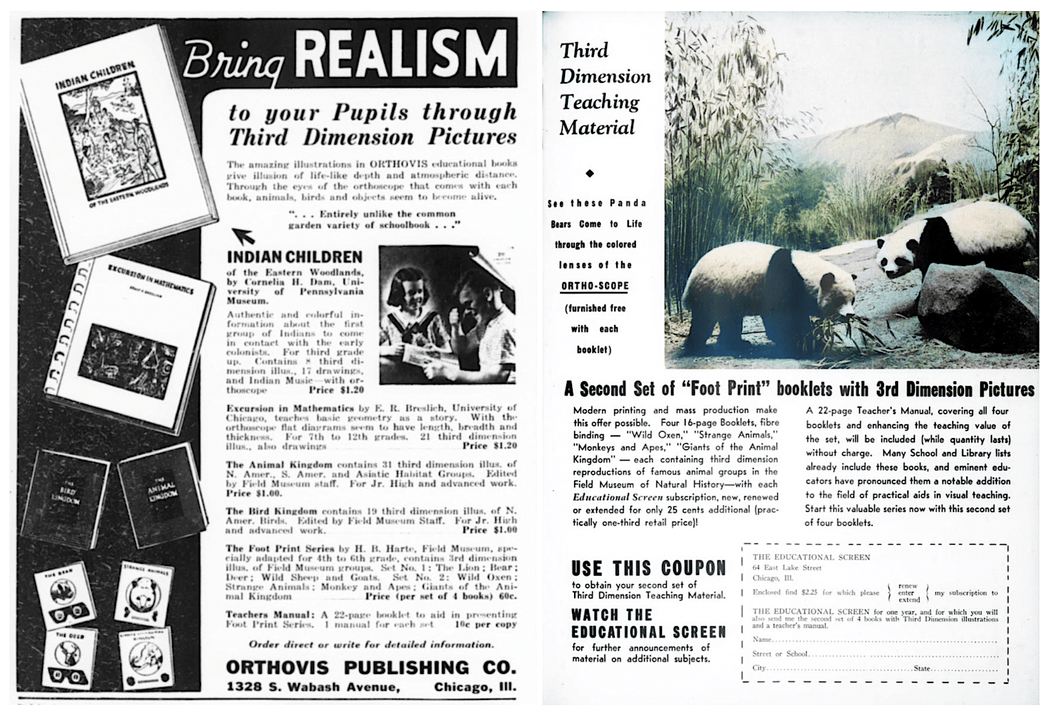 “The amazing illustrations in ORTHOVIS educational books give the illusion of life-like depth and atmospheric distance. Through the eyes of the orthoscope that comes with each book, animals, birds and objects seem to become alive.” —Orthovis advertisement, 1938