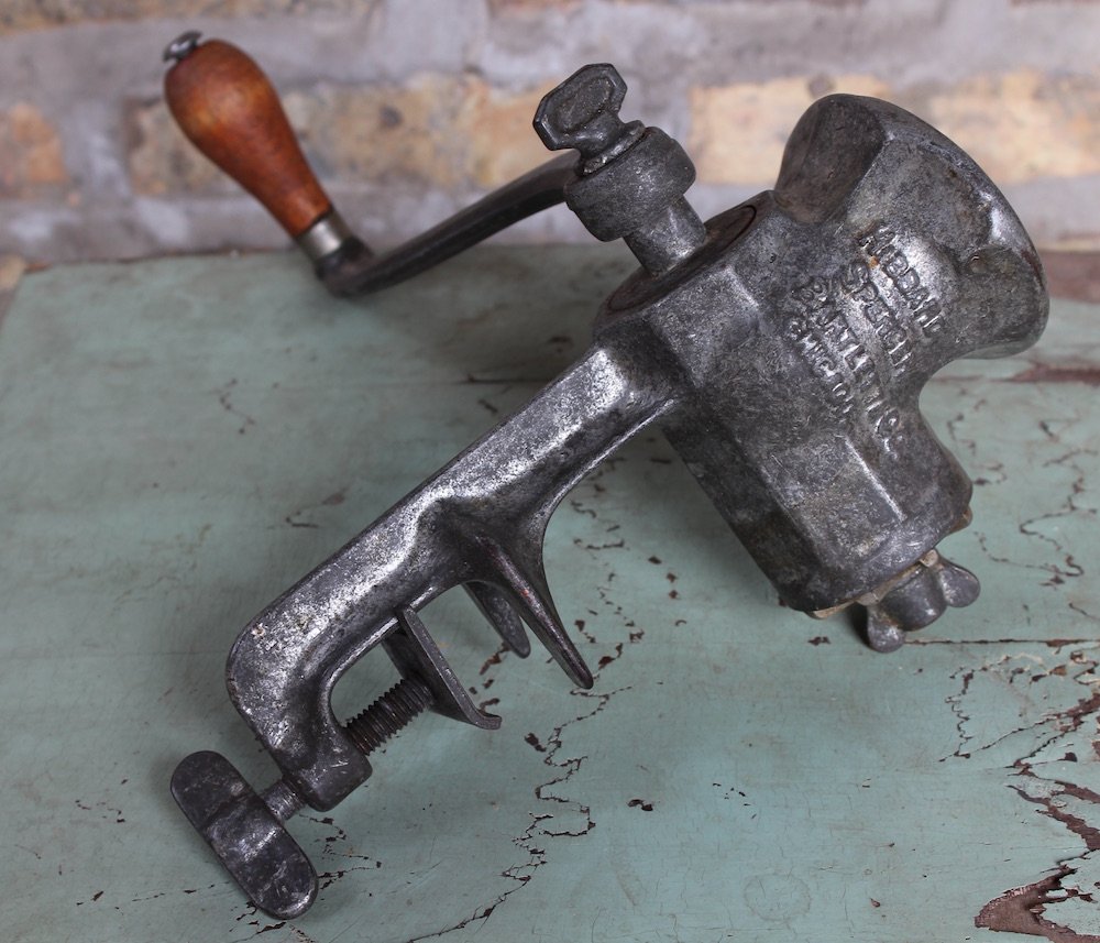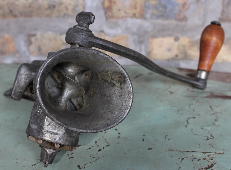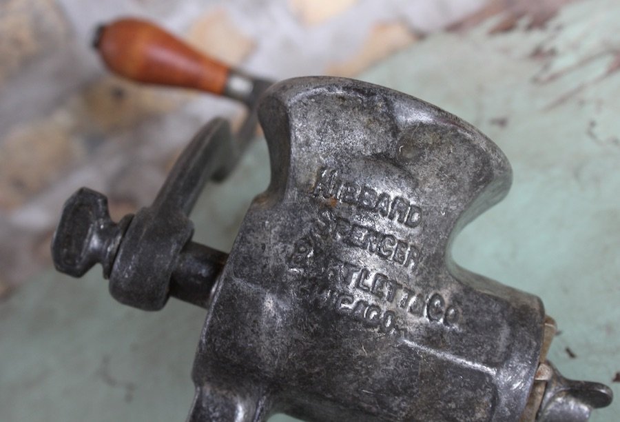 This particular O-V-B (“Our Very Best”) No. 70 Food Chopper was advertised to merchants in the 1916 Hibbard, Spencer, & Bartlett catalog for a price of $18 for a dozen, or a buck-fifty per chopper. A full 100 years later, I paid a whopping five dollars for one at an Uptown garage sale. Sounds like a rip-off, but since $1.50 in 1916 is about $33 with inflation, I’m going to call myself a clever bargain hunter.