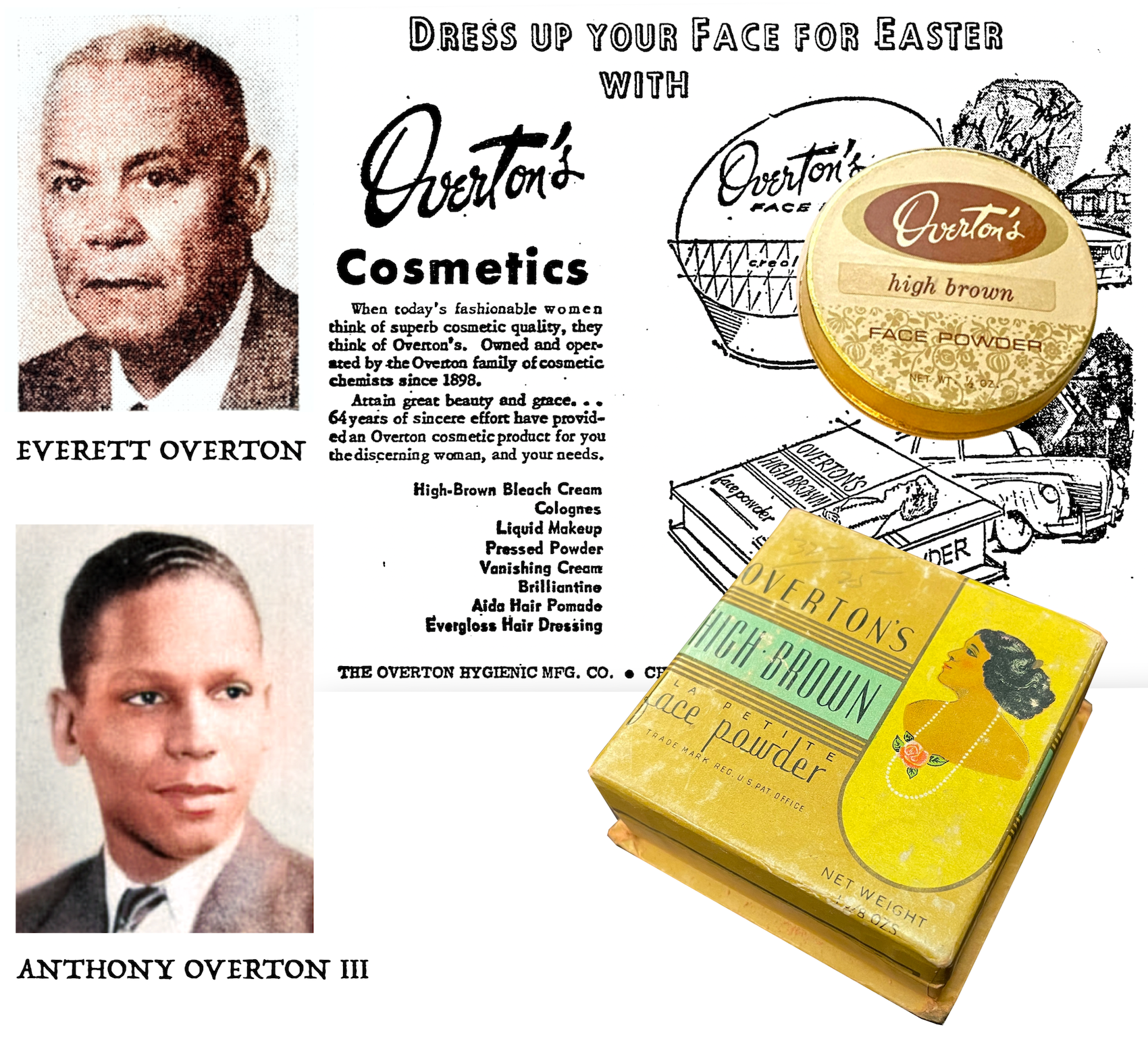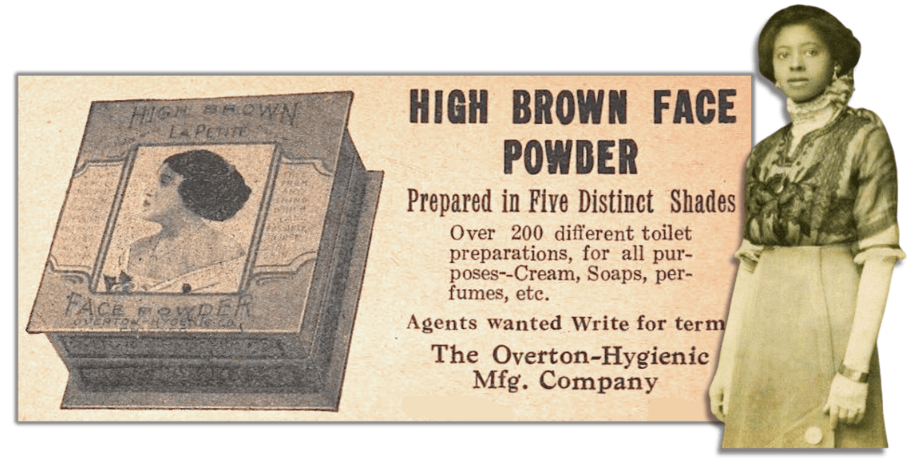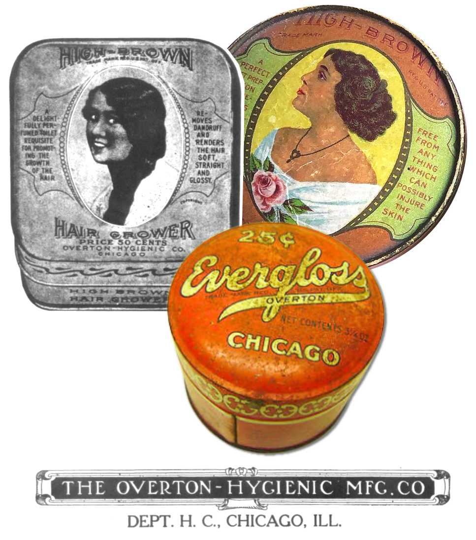“In twenty-five years this business has grown from a small, one-room shop to one of the finest concerns in the world for the production of toilet articles,” the Half-Century noted in a 1923 ad/article. “Today this is a national institution, with its agencies and customers dotting the country from coast to coast. The reasons for this remarkable growth are not hard to find. The Overton-Hygienic Co. has given service and made HIGH-BROWN Toilet Preparations superior in quality.