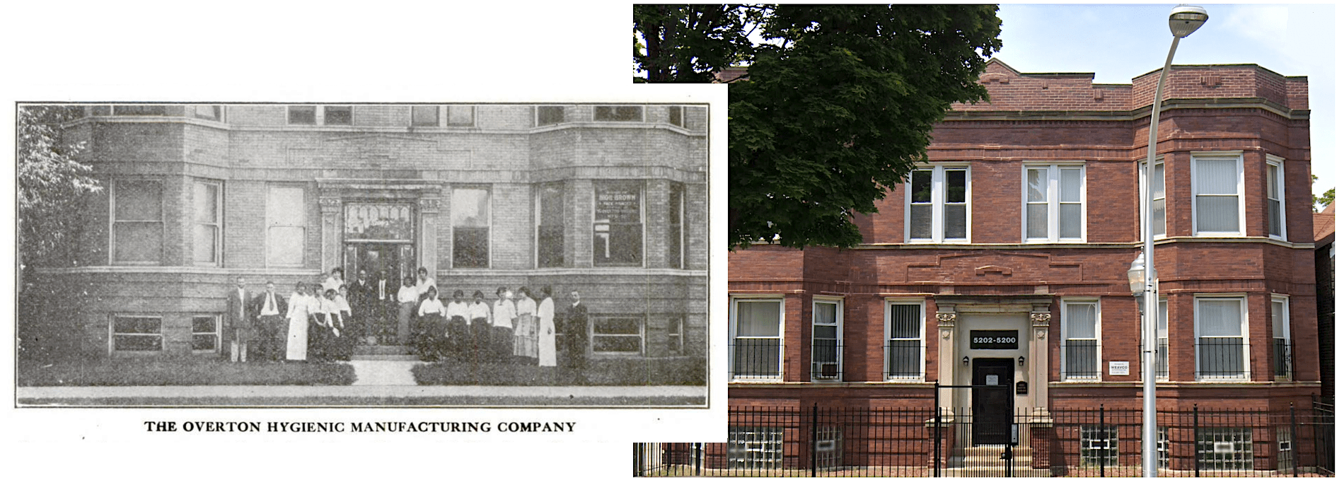 [Then and Now: The original Chicago headquarters of the Overton-Hygienic MFG Co. at 5200 S. Wabash Ave., as seen in 1915 and 2023]