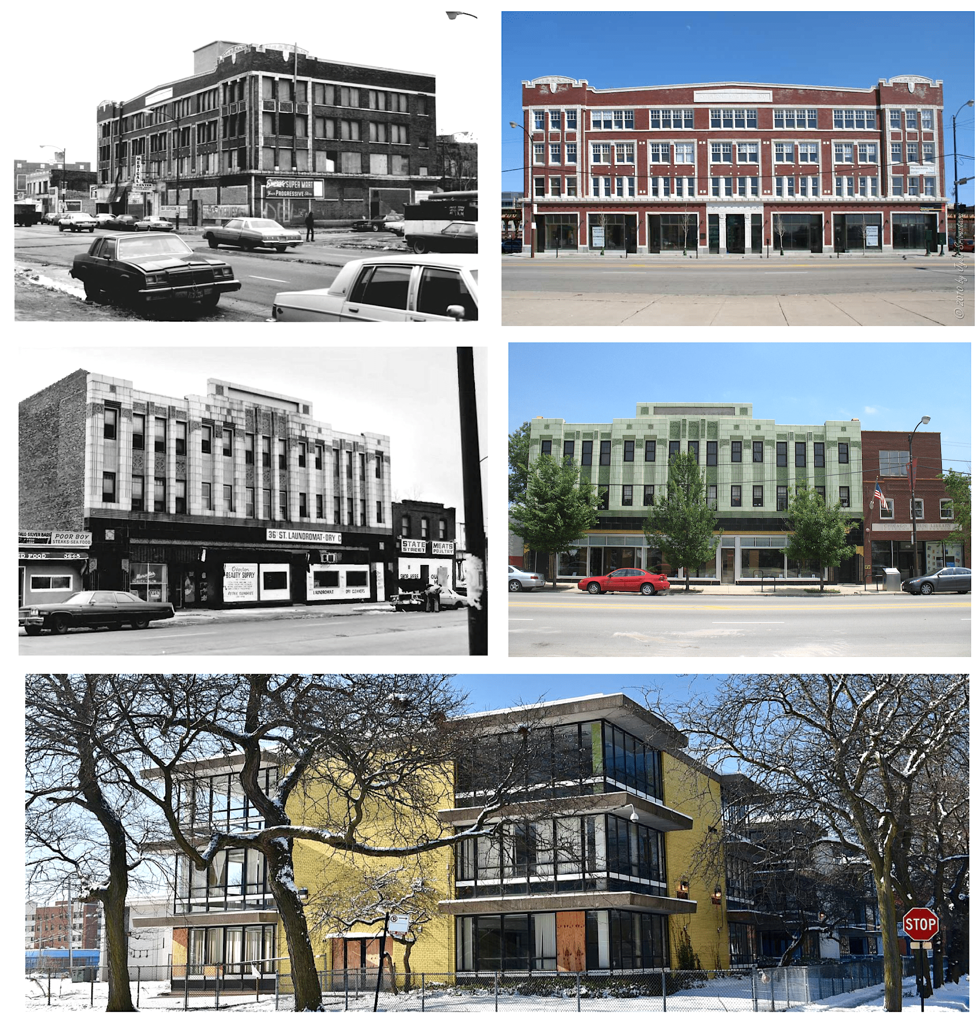 [Top: The Overton-Hygienic Building boarded up in the 1970s and renovated in the 2020s. Middle: The Chicago Bee Building before and after its similar refurbishment. Bottom: The former Anthony Overton Elementary School at 221 E. 49th Street, which was opened in 1963 and closed in 2013. Its proposed future as a community center has been slow to develop.]