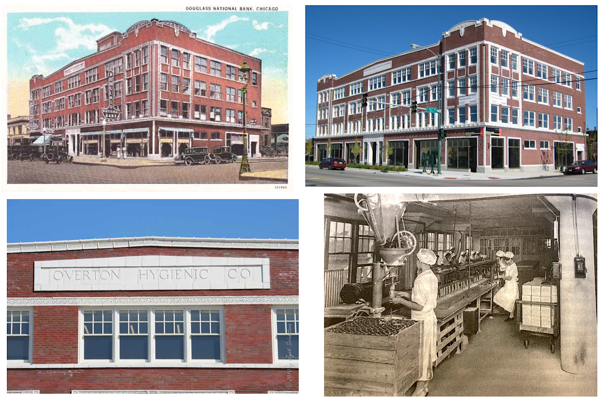 [Top Left: Postcard of the Overton-Hygienic Building / Douglass Bank Building, 1928. Top Right: The same building, recently renovated, at 3619-3627 S. State St. Bottom Left: Preserved Overton sign at the top of the building. Bottom Right: Workers inside the cosmetics production area in the upper floor of the building, 1920s.]
