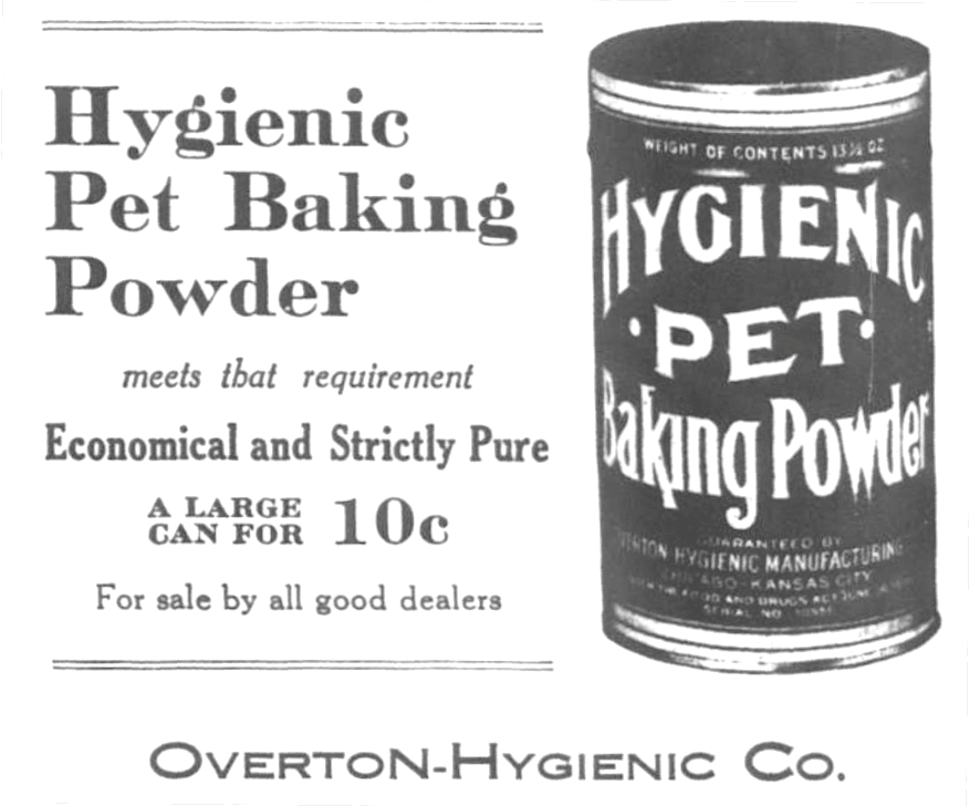 After his failures in Oklahoma, Overton and his new wife Clara settled in Kansas City, where they raised their four children through the 1890s into the new century. Here, Anthony tried his hand at the mercantile trade once more, and slowly built a steady enterprise. By 1898, he’d earned enough capital to start producing a few grocery items under his own Overton brand name, starting with a line of baking powder. This is how the Overton Hygienic Manufacturing Company was born.