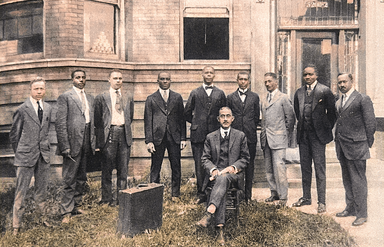 [Anthony Overton (seated) with his sales team outside the Wabash Avenue offices, 1916. Colorized image. Part of the Everett & Ida Overton collection]