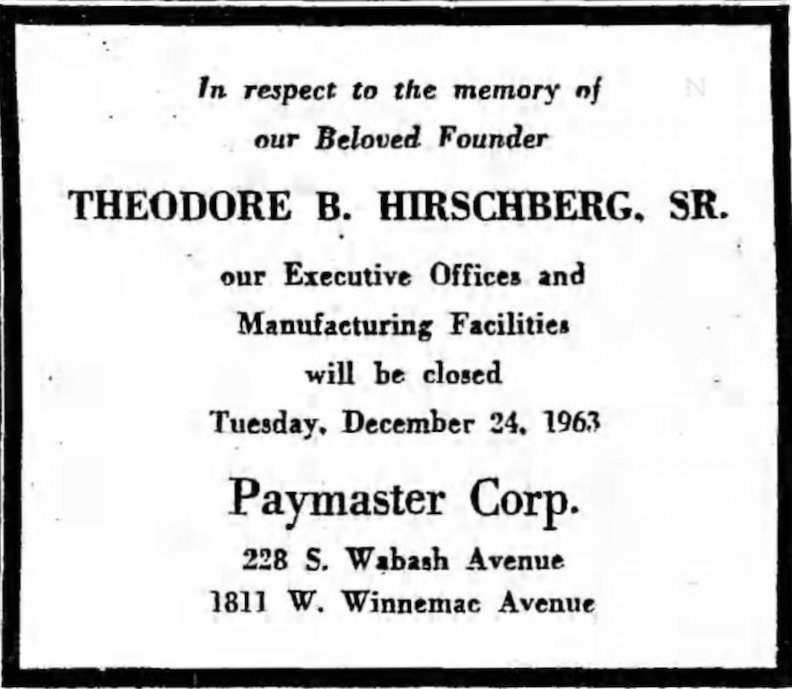 “Ted Hirschberg Sr. was one of the most brilliant and successful salesmen and businessmen in the checkwriter business. He taught me all I know, including making me first a mechanic, then a salesman for about five years, and then how to be an administrator and President of the Paymaster Corporation. His first consideration in business was always the salesman on the road and/or anyone connected with the Paymaster Corp. . . . I have carried on in the same tradition and at the same time have tried to make as many improvements for all concerned as were within my power, and I assure you that I am fully active in the business and will continue to do all I can for all concerned.” –Ted Hirschberg, Jr. writing in the January 1964 edition of the Paymaster “Chatterbox” newsletter following his father’s death