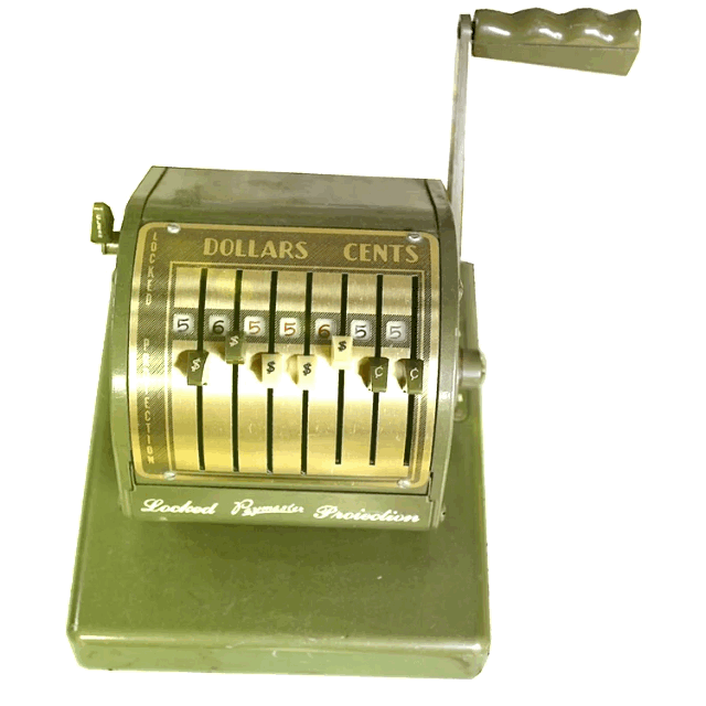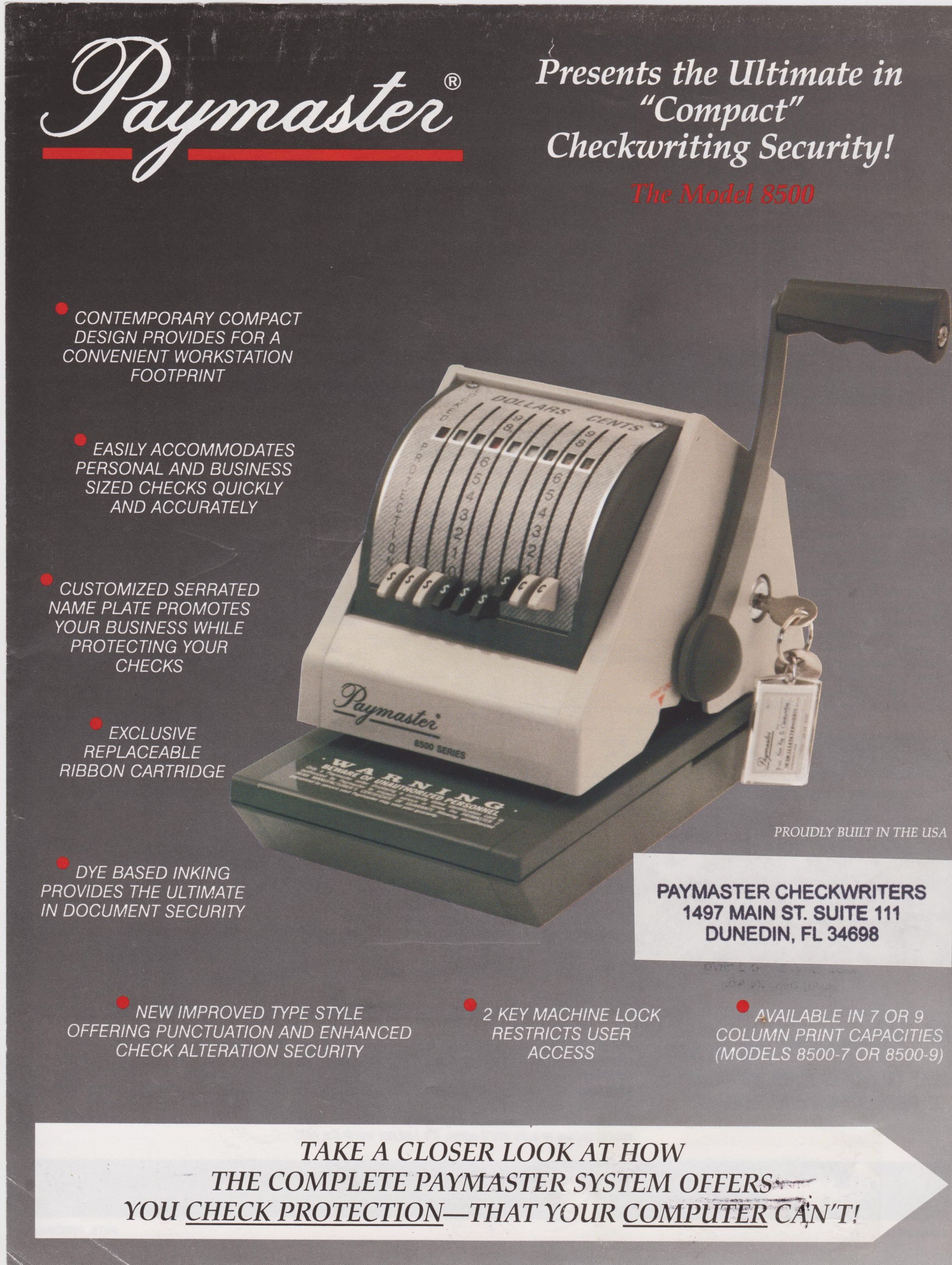 Ironically, check protectors did sometimes pose their own security risks, since a disgruntled employee could theoretically use the machine to create a $99,999.99 payout much in the way the old-school “scratchers” used to. That’s why Paymasters came with a lock and key. It was usually just the business owner and one trusted employee in human resources who had the power to pull the lever.