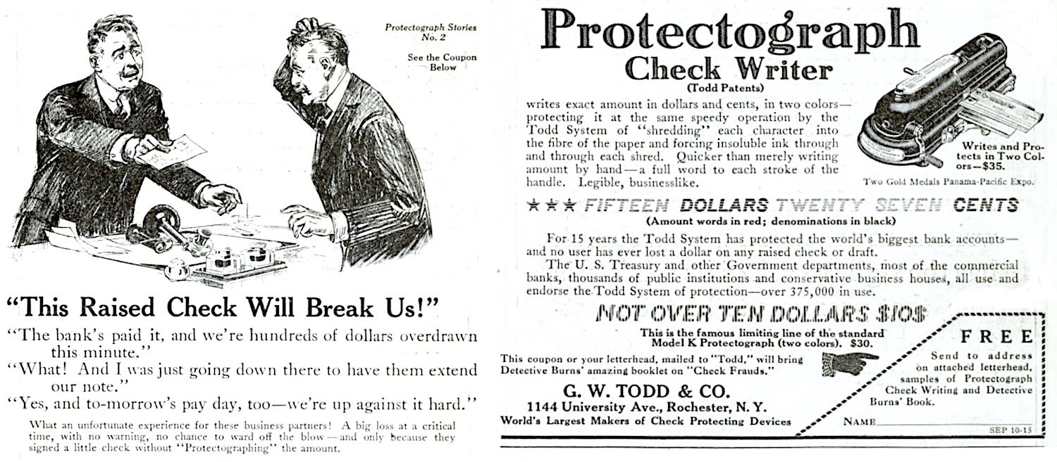 “The Checkometer makes almost impossible the criminal alteration in a check after its drawing,” read one 1923 advertisement. “Simple in build and quick of operation, it effectually blocks a doorway through which thousands of crooks have found access to ‘easy money.'”