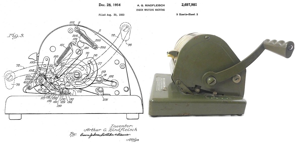 [Patent image from a Paymaster check writer developed by Arthur G. Rindfleisch, 1950]