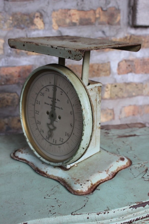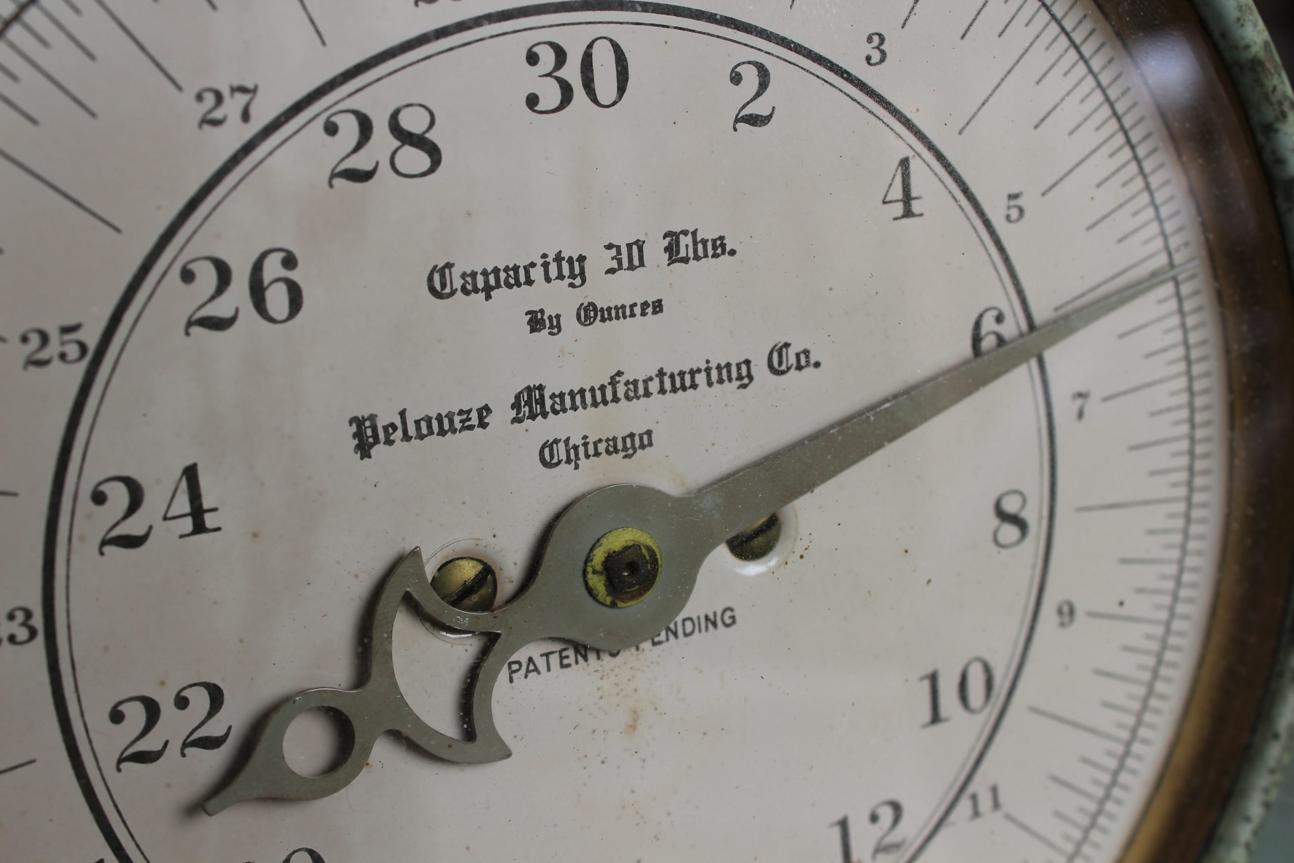 There’s no getting around it. Kitchen scales, aka “family scales,” take up a lot of the real estate in the Made-in-Chicago Museum. This mint green beaut is one of several scales in our collection made by the Pelouze Manufacturing Company, maybe the best known of the many Chicago based spring scale companies of the early 20th century. We’re currently estimating this one as a 1940s model, but it could very easily be older. We’re still investigating. As a 30 LB scale, though, it is a bit unique vs. the more common 24 LB capacities of a lot of family scales of the era.
