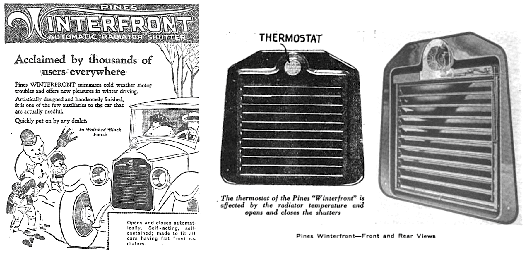 “This winter give your car and yourself a break. Avoid coughing starts, long warm-up periods, a frozen radiator, a heater that won’t heat. Anti-freeze solution only prevents water from freezing solid; it does not warm the water. Neither does a thermostat. That is the Winterfront’s job—and it does it properly, scientifically.” —Pines Winterfront newspaper ad, 1937