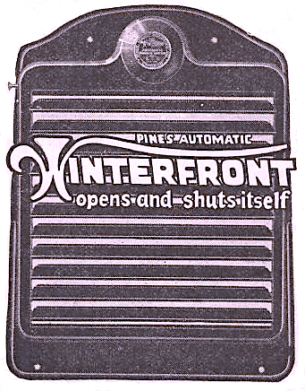 “Winterfront is a necessity for winter driving because it regulates the inflow of cold, thereby maintaining the motor at highest efficiency. It is an important factor in keeping thousands of cars in operation during the winter and has been of big help in bringing about the ’12-month motor car.’” —Pines Winterfront advertisement, 1925