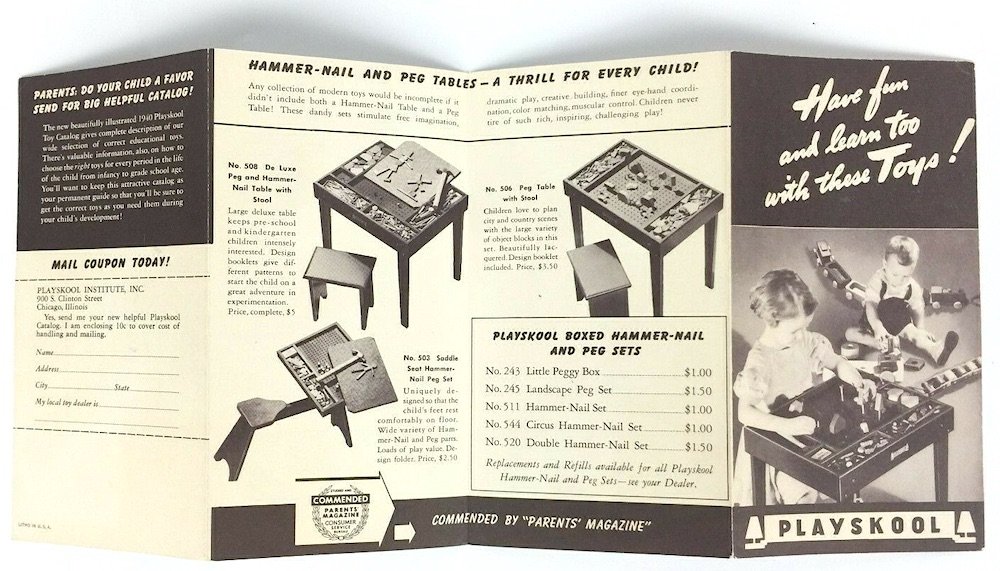 Heading into 1940, Playskool was still in flux. The company had virtually zero ad budget, and its catalog of toys had pretty well plateaued with a few dozen offerings: among them the popular “Hammer-Nail Set,” along with various wooden pull trains, peg boards, and stacking blocks.