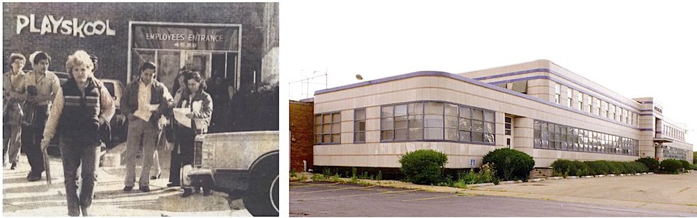 [Left: Workers outside the Playskool plant entrance at 4533 W. Augusta Blvd., 1984. Right: A more recent view of the distinctive Streamline Moderne style facility that Playskool occupied from 1973 to 1985.]