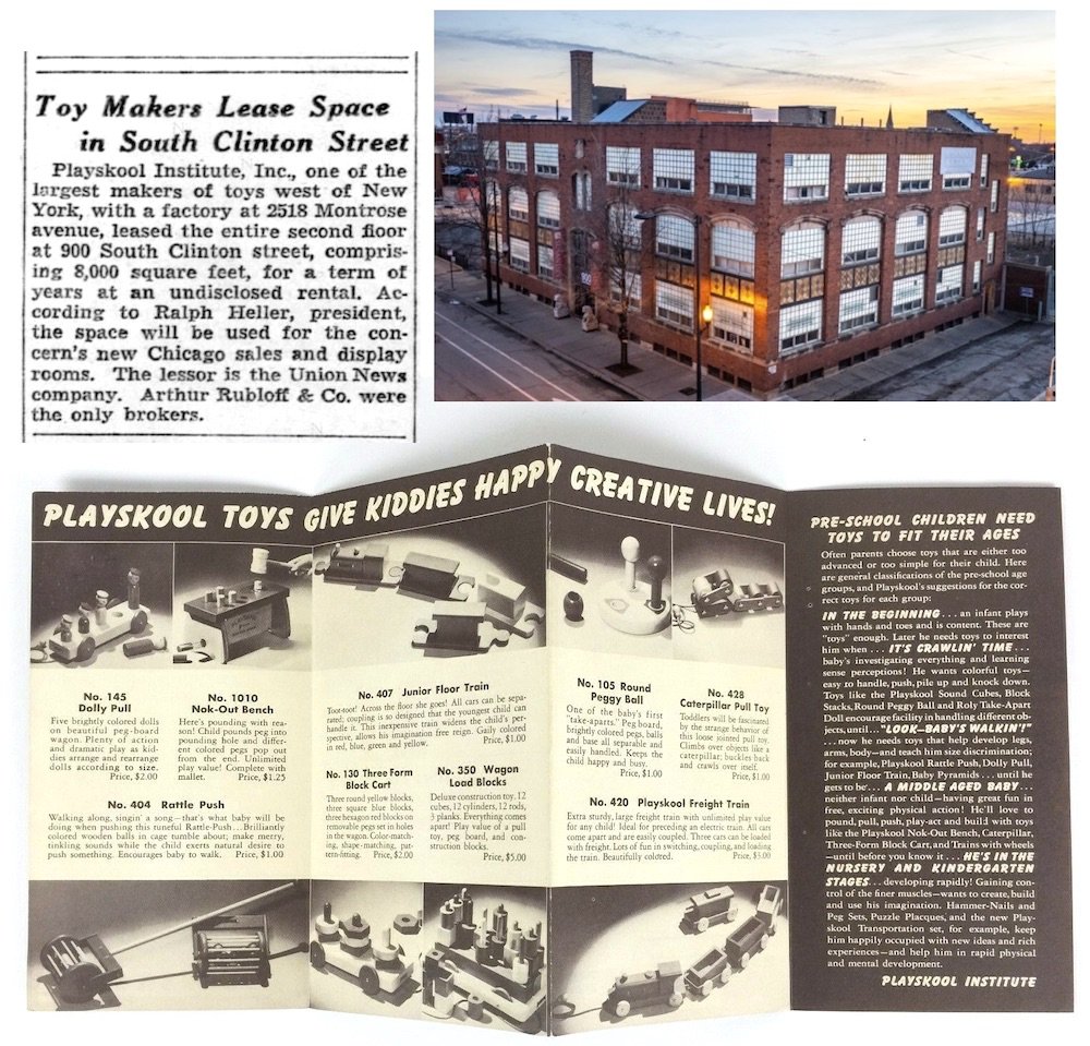 [Playskool briefly occupied the second floor of the building pictured above at 900 S. Clinton Street from the late 1930s into the early 1940s; the same time period this small catalog flyer was published]