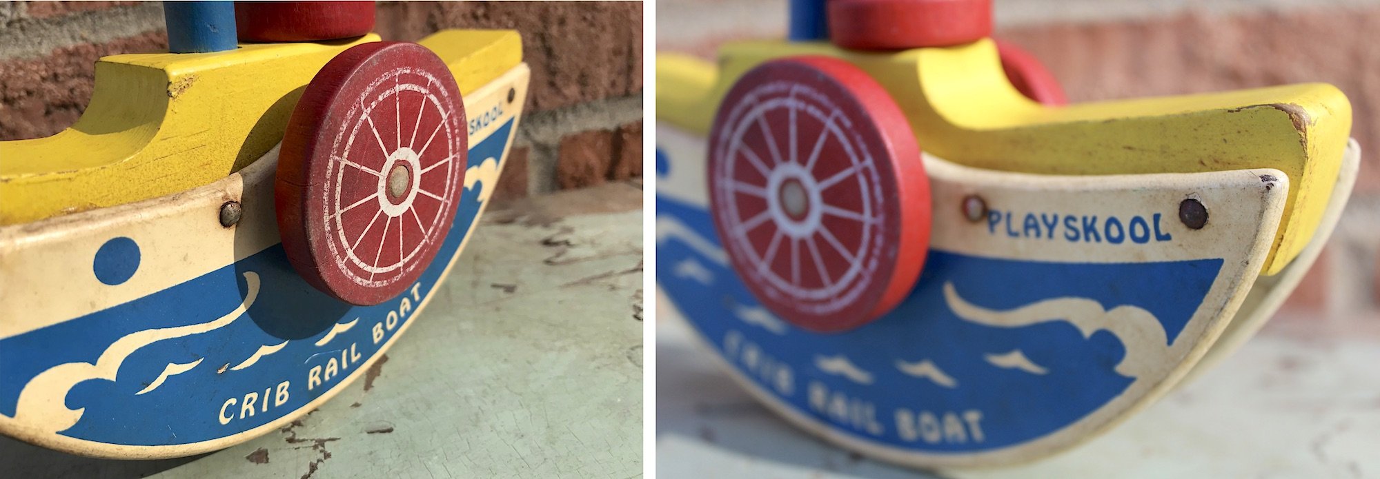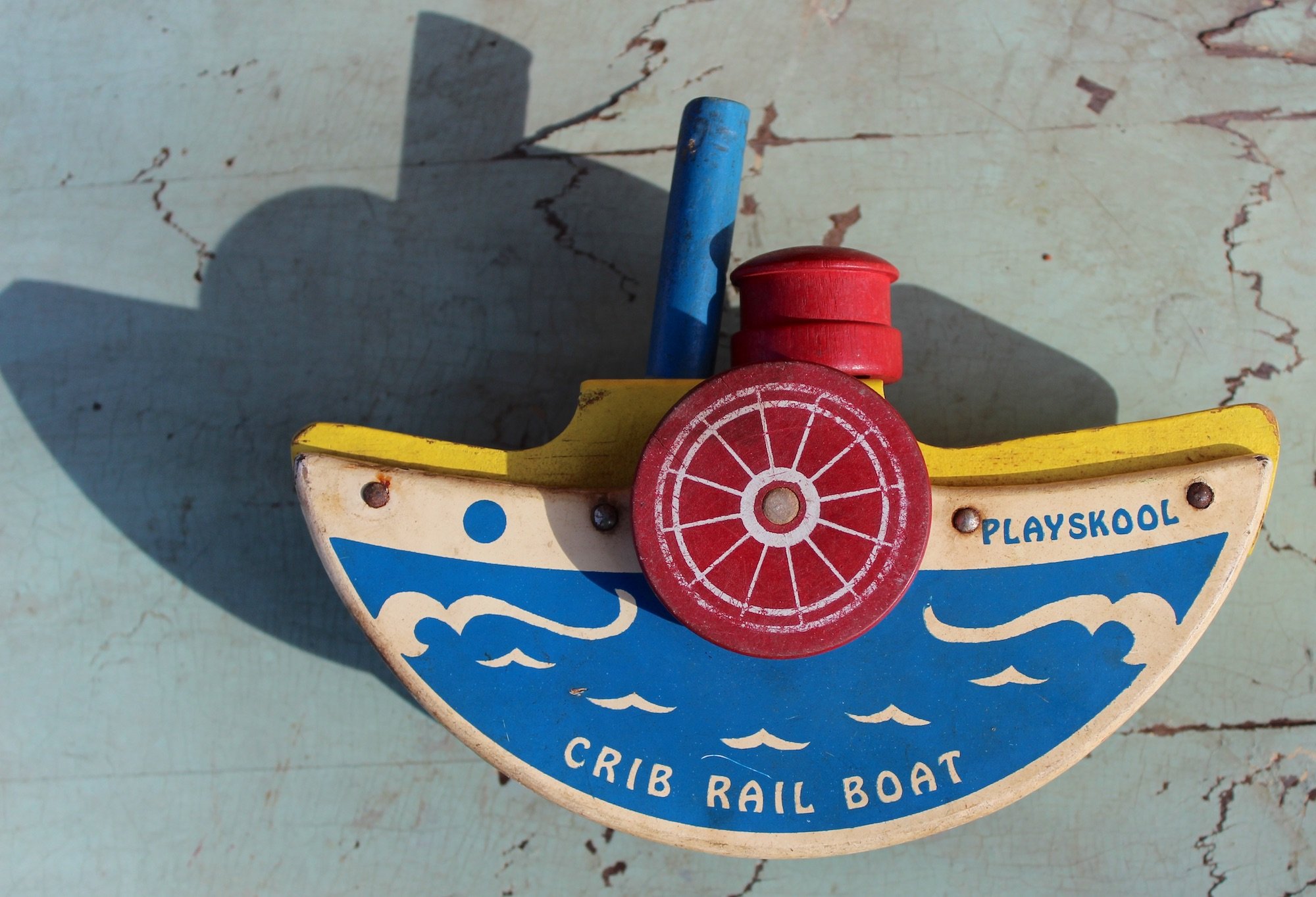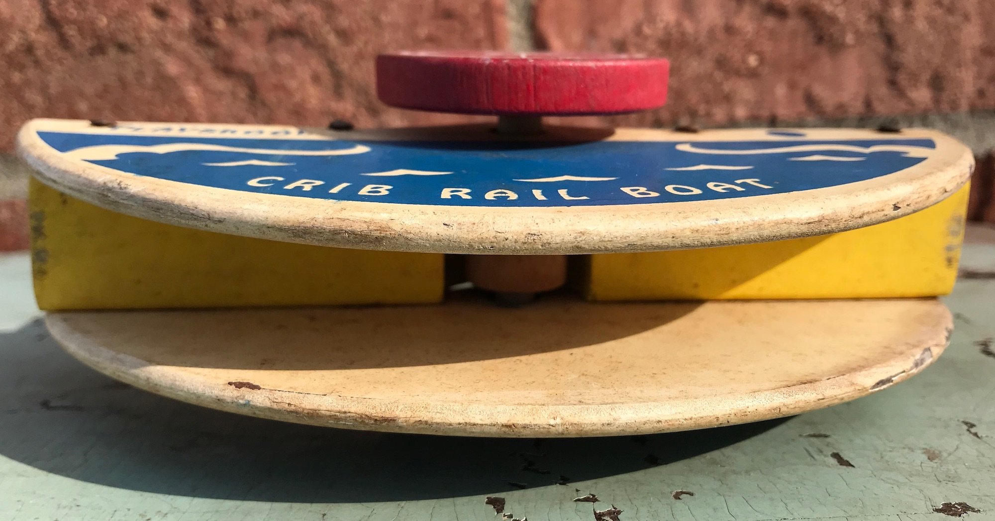 [As described in a Sears catalog, the Crib Rail’s Boat’s “paddle wheel spins so the boat slides along the rail of a playpen or crib. Delights and intrigues. Also rocks on floor. $1.39”]