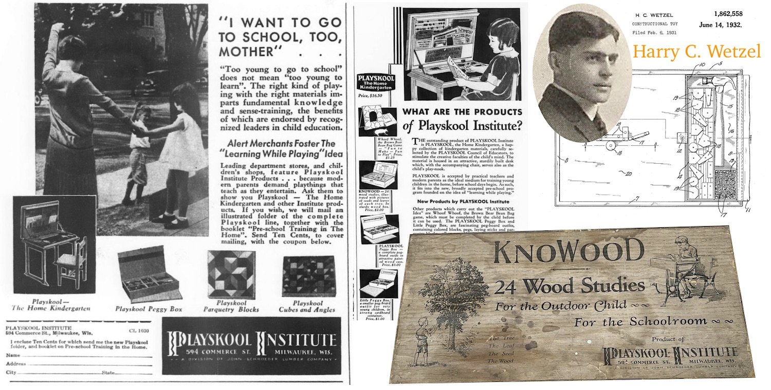 In 1931, the Playskool Institute officially evolved from a division of John Schroeder Lumber into its own incorporated business in Milwaukee, “dealing in toys, mechanical goods, woodenware, earthenware, clay products, etc.” When the creation of Playskool Institute, Inc. was announced on October 10, 1931, however, neither Harry Hansen nor Lucille King were listed among the incorporators. Instead, there were three men from within the Schroeder Lumber ranks—E. J. Schickel, Benjamin Springer, and Harry C. Wetzel. Springer had developed the KNOWOOD kit, and Wetzel was one of the men who helped improve Hansen’s original Playskool desk, eventually patenting a similar educational “constructional toy” kit in 1932, which taught pre-school children how to safely use hammers and nails—a necessary skill, I suppose, for toddlers of the Depression.