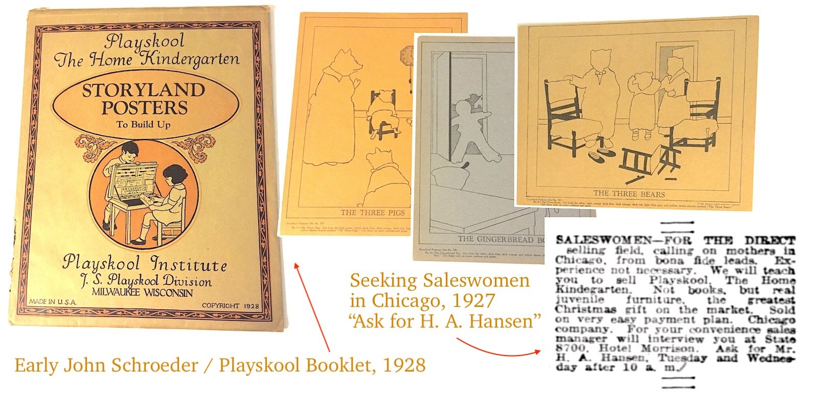 This whole “Home Kindergarten” idea was truly the bee’s knees, as folks would have said back then. By October of 1927, Frederick J. Schroeder, president of the John Schroeder Lumber Company, had already approved the creation of a “Playskool Division” to mass produce it, and though based in Milwaukee, the company carried on a presence in Chicago, recruiting salesmen and women from an office at 450 E. Ohio Street. In November of the same year, ads in the Chicago Tribune find Harry Hansen himself training potential Playskool saleswomen from a makeshift office in the Hotel Morrison.