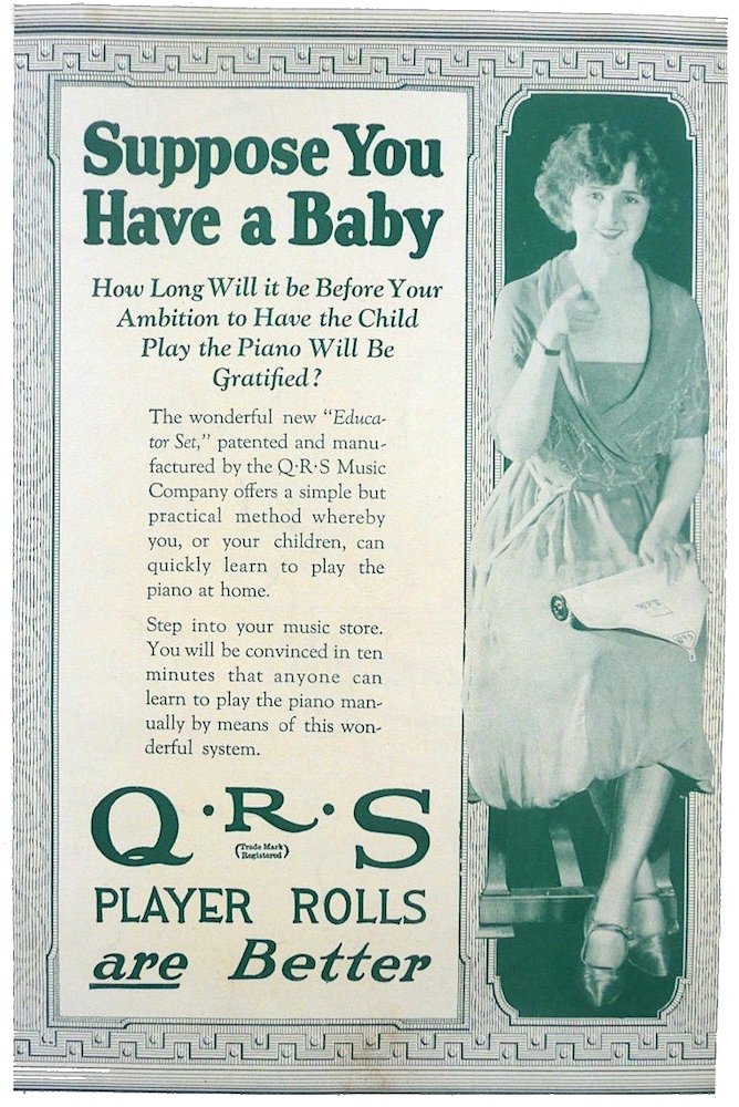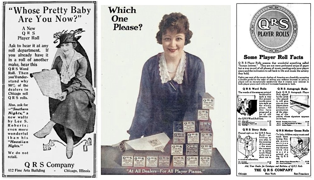 “If you already have it in a roll of another make,” read one 1916 ad for the new recording of Whose Pretty Baby Are You Now?, “hear this QRS Word Roll. Then you’ll understand why 90% of the dealers in Chicago sell QRS rolls.”