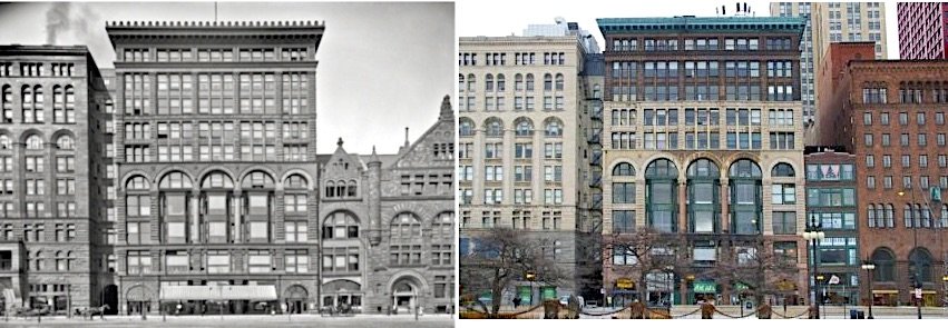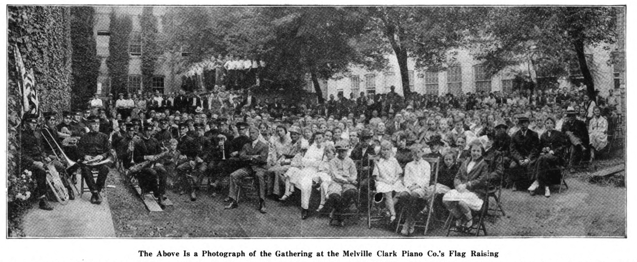 [Above: The QRS and Melville Clark corporate offices were located in Chicago’s Fine Arts Building at 412 S. Michigan Ave. for much of the 1910s, seen above then and now. Below: 400 employees of Clark and QRS attend a service flag raising at the DeKalb campus in 1918]