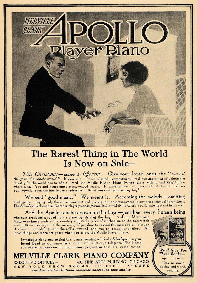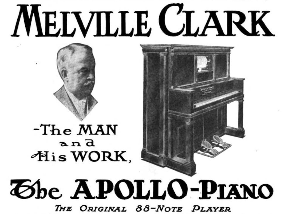 From its first plant on West Madison Street, the Melville Clark Company soon had 150 men and women in its employ. Many were working to produce the world’s first mechanized, 88-note upright piano with a built-in player mechanism; a Clark invention that he dubbed the “Apollo” (previous options on the market were usually limited to 65 notes). Rather than using a vacuum motor to run the music rolls—as was common in other models—the Apollo used a spring-wound clockwork motor that was wound by pumping the piano’s pedals. Later models required no human guidance at all, a factor which differentiates a “reproducing piano” from a standard player piano.