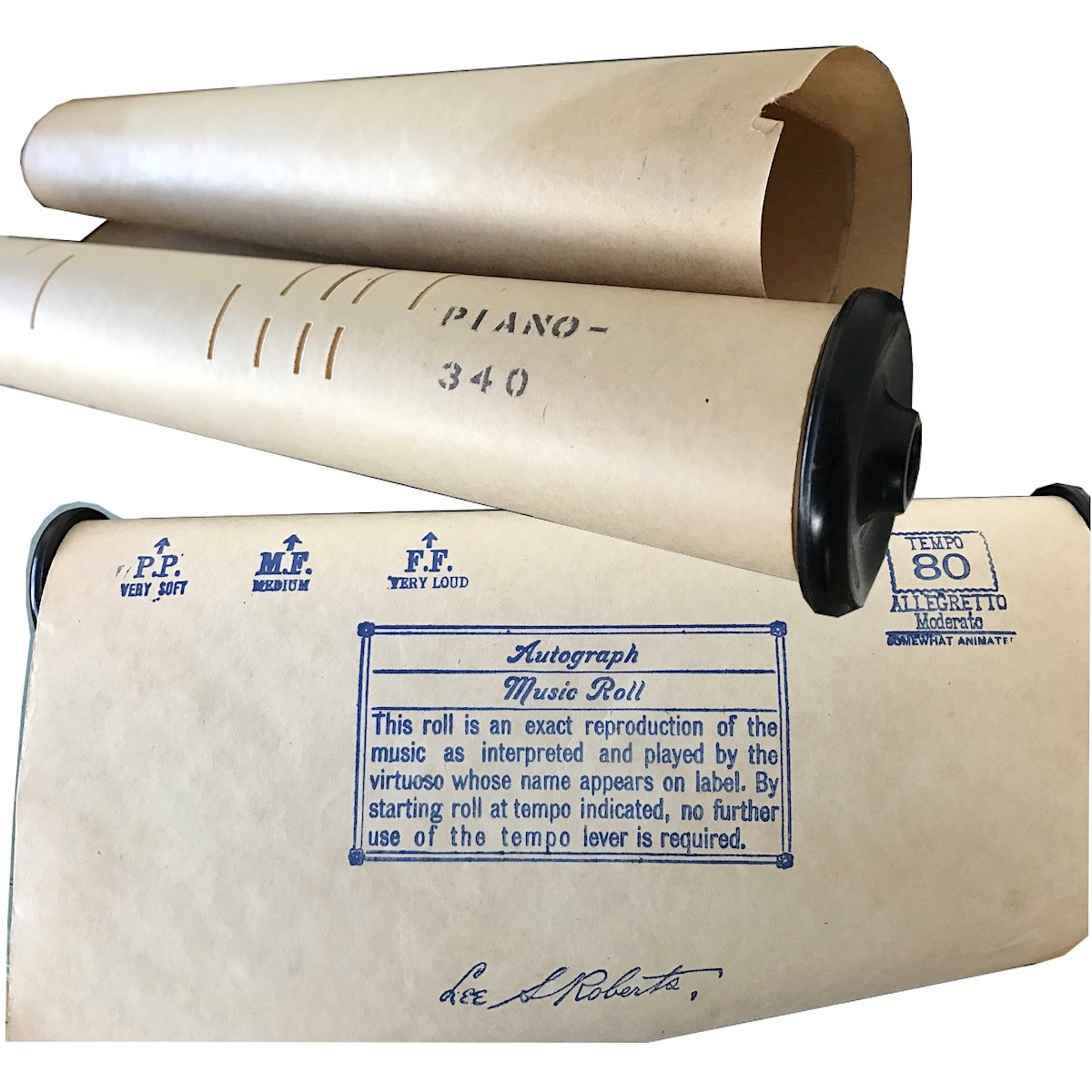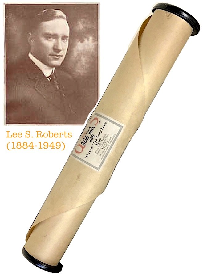 Branded as an “Autograph Word Roll” (No. 340), our particular unraveled scroll features the piano stylings—and literal stamped autograph—of Lee S. Roberts (1884-1949), a prolific songwriter and piano roll recording artist who also happened to be the vice president of the QRS Co.