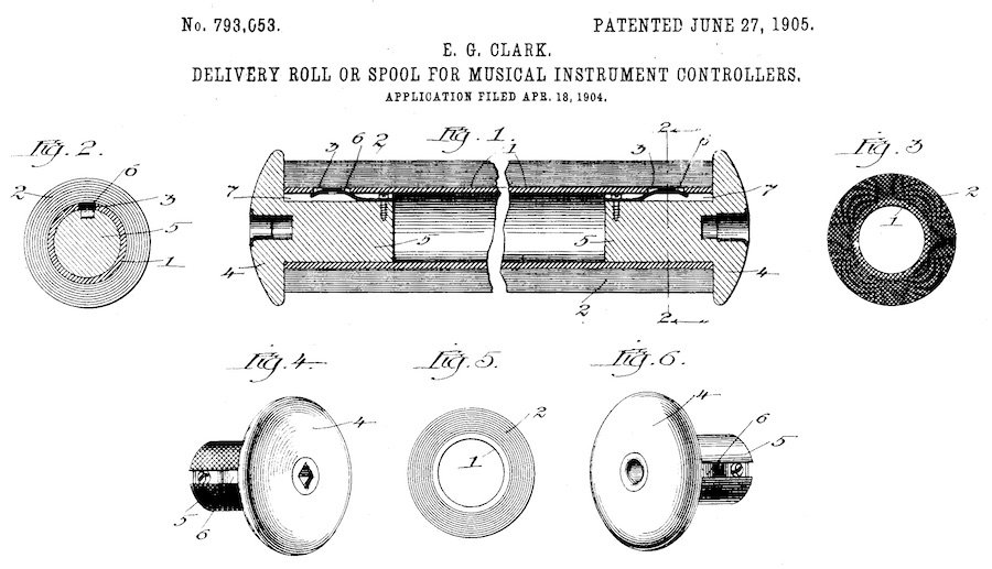 [An early Ernest G. Clark patent for a “delivery roll or spool for musical instrument controllers,” 1905. While Ernest was 18 years younger than his brother Melville and routinely overshadowed, his inventions were just as important to the success of both the Apollo pianos and QRS rolls]