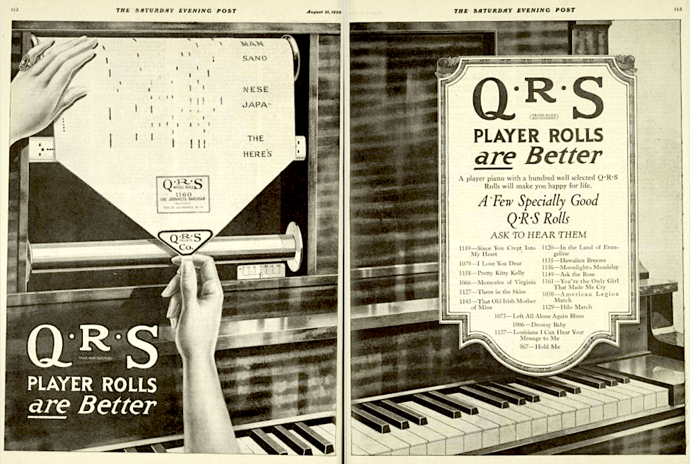“Q-R-S Player Rolls are made from the ‘master patterns’ which are recorded from the hand playing of great pianists. Expense is not spared in making Q-R-S ‘masters.’ No pianist is too prominent—no fee too large to pay for the sake of getting out a Q-R-S Roll that is up to our quality standard.” —QRS Company ad, 1919